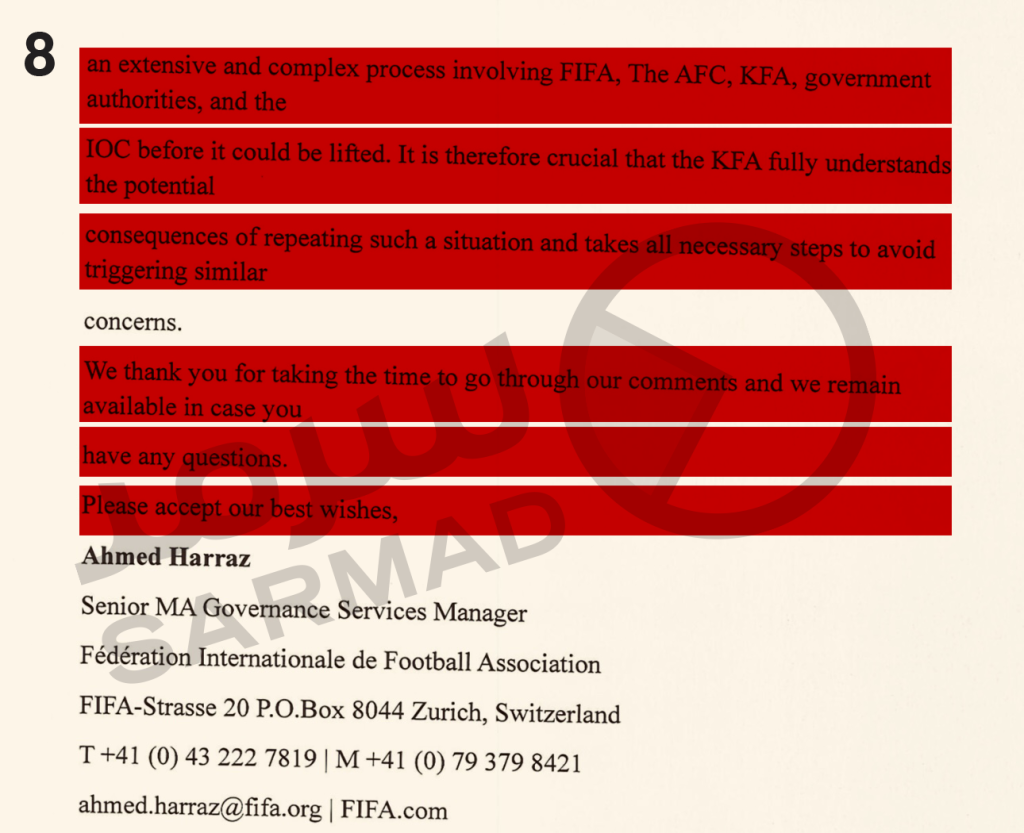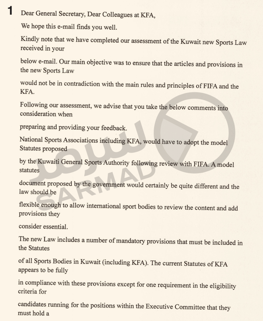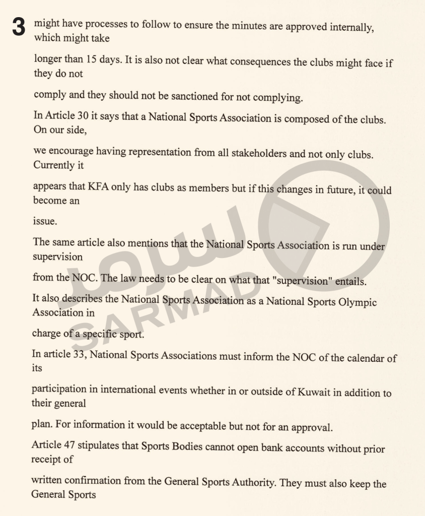 وأخيرًا، نود تذكير الاتحاد الكويتي لكرة القدم بأهمية التأكد من أن التشريع الجديد لا يمس باستقلالية الاتحاد، فقد أدت مسائل مشابهة في الماضي إلى أزمة كبيرة عندما تم تعليق عضوية الاتحاد في الفترة ما بين عامي 2015 و2017 بسبب التدخل الحكومي. وهو تعليق استدعى عملية معقدة وطويلة شارك فيها الفيفا والاتحاد الآسيوي لكرة القدم والاتحاد الكويتي لكرة القدم والسلطات الحكومية واللجنة الأولمبية الدولية قبل أن يتم رفعه. لذا من المهم أن يدرك الاتحاد الكويتي لكرة القدم تماماً العواقب المحتملة لتكرار مثل هذا الوضع، وأن يتخذ جميع الخطوات اللازمة لتجنب إثارة مخاوف مماثلة.