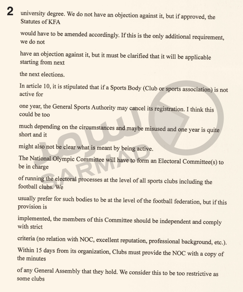 والأهم من ذلك، في نفس المادة، إذا شعرت اللجنة التنفيذية للاتحاد الكويتي لكرة القدم أو أي اتحاد رياضي وطني آخر لأي سبب، فإن اللجنة الأولمبية الوطنية، بالتشاور مع الاتحاد الدولي لكرة القدم (فيفا) أو الاتحاد الدولي المعني، تعين لجنة «تسوية». ونظراً لأن لوائح الاتحاد الدولي لكرة القدم تنص بالفعل على تعيين لجنة (تسوية)، فيجب الاعتراف بذلك في القانون وترك الأمر لتقدير الاتحاد الدولي لكرة القدم.