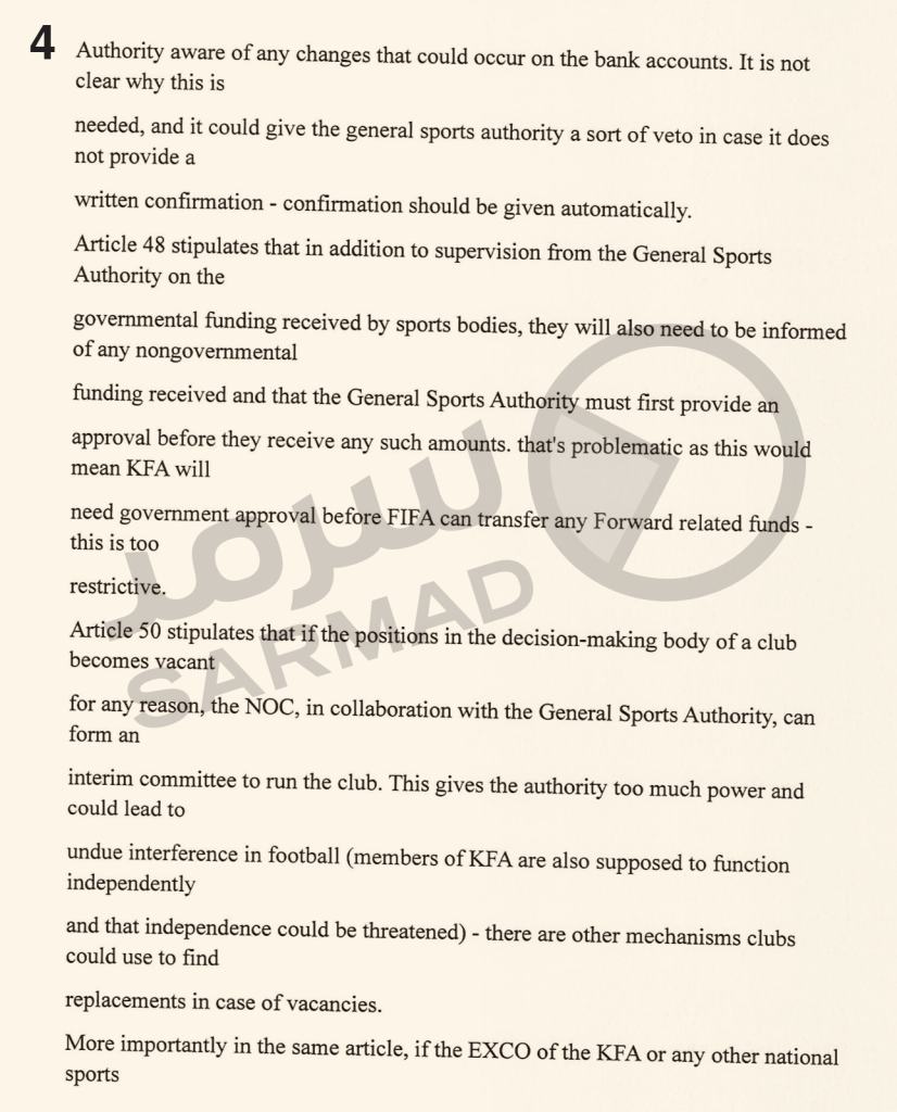 وكذلك تنص المادة (48) على أنه بالإضافة إلى إشراف الهيئة العامة للرياضة على التمويل الحكومي الذي تتلقاه الهيئات الرياضية، فإنه يجب إبلاغها بأي تمويل غير حكومي قبل استلامه والحصول على موافقة مسبقة منها. وهذا أمر إشكالي، إذ يعني أن الاتحاد الكويتي لكرة القدم سيحتاج إلى موافقة حكومية قبل أن يتمكن الاتحاد الدولي لكرة القدم من تحويل أي أموال مرتبطة ببرنامج «Forward»، وهو أمر مقيّد للغاية.