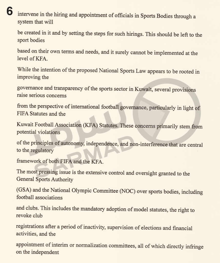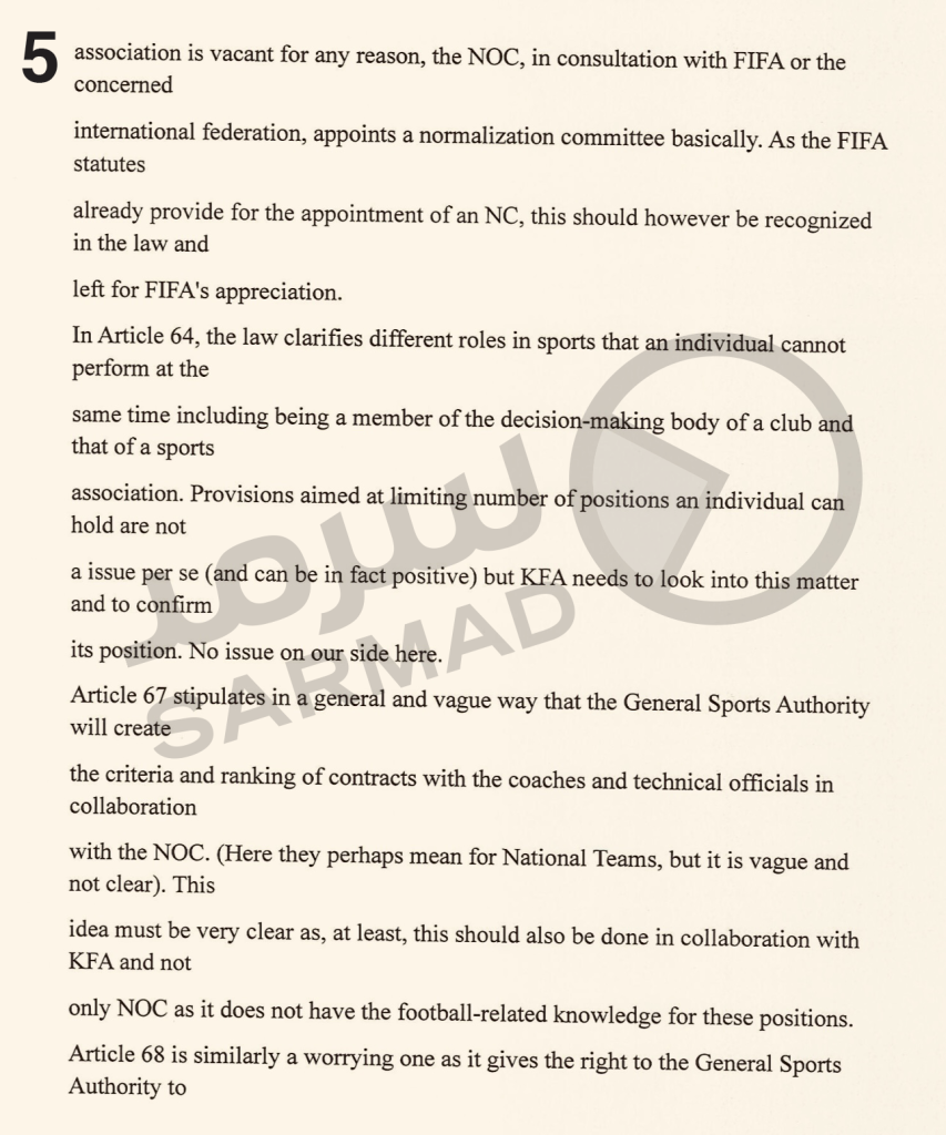 وأشار الاتحاد الدولي لكرة القدم في تقييمه لمسودة القانون، التي حصلت «سرمد الرياضية» على نسخة منه، إلى عدة ملاحظات من أبرزها: