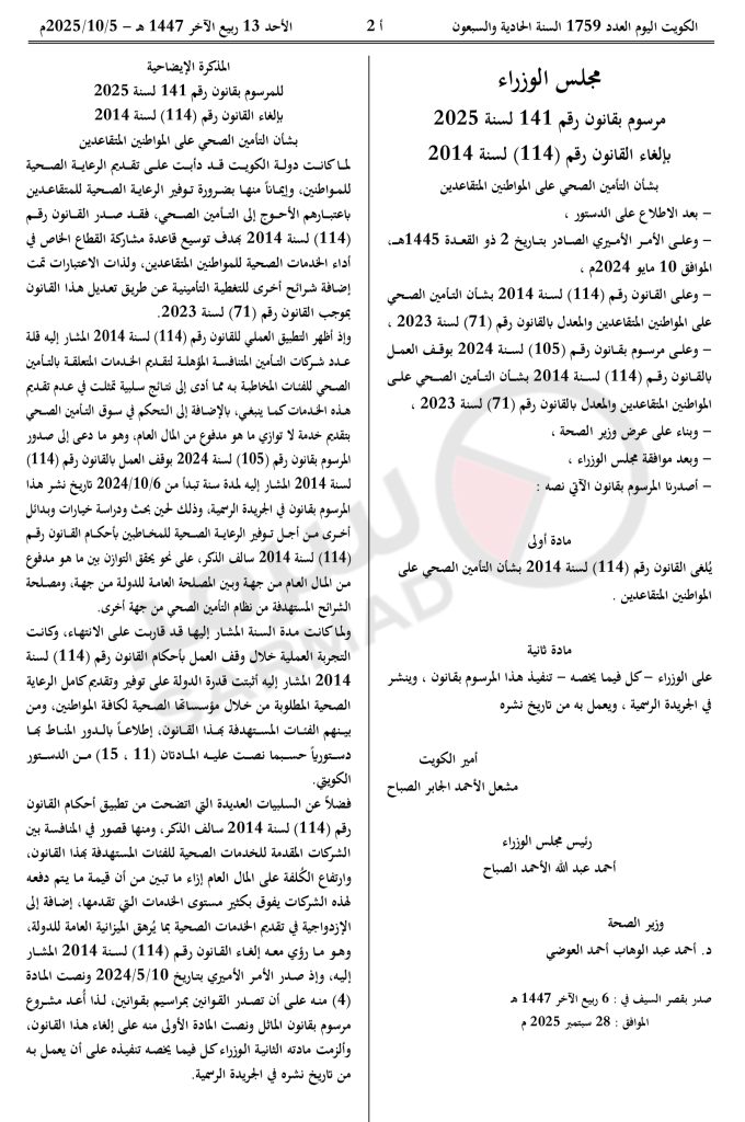 صدر صباح اليوم الأحد في الجريدة الرسمية «الكويت اليوم» المرسوم بقانون رقم 141 لسنة 2025 بإلغاء القانون رقم (114) لسنة 2014 بشأن التأمين الصحي على المواطنين المتقاعدين «عافية».