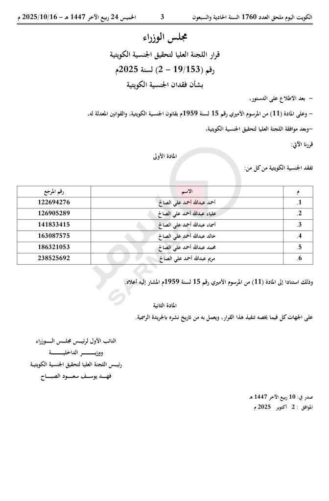 صدر صباح اليوم الخميس في الجريدة الرسمية «الكويت اليوم»، قرار اللجنة العليا لتحقيق الجنسية رقم (153 / 19 – 2) لسنة 2025 م بفقدان الجنسية من 6 أشخاص، استناداً للمادة 11 من المرسوم الأميري رقم 15 لسنة 1959 بقانون الجنسية الكويتية والقوانين المعدلة له.