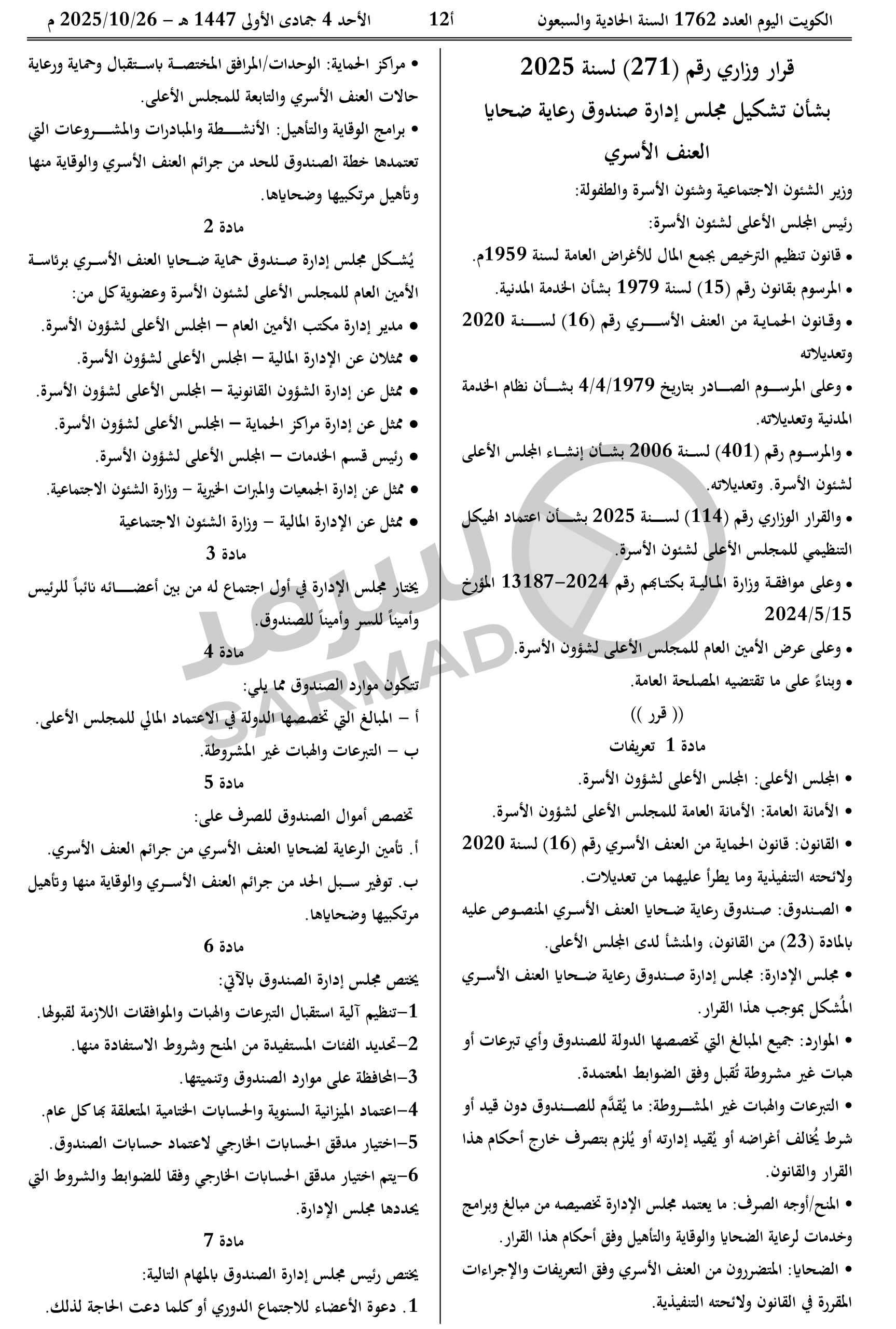 وجاء في المادة الأولى من القرار، (تعريفات) «المجلس الأعلى: المجلس الأعلى لشؤون الأسرة، الأمانة العامة: الأمانة العامة للمجلس الأعلى لشؤون الأسر، والقانون: قانون الحماية من العنف الأسري رقم (16) لسنة 2020 ولائحته التنفيذية وما يطرأ عليهما من تعديلات، والصندوق: صندوق رعاية ضحايا العنف الأسري المنصوص عليه بالمادة (23) من القانون، والمنشأ لدى المجلس الأعلى، ومجلس الإدارة: مجلس إدارة صندوق رعاية ضحايا العنف الأسري المشكل بموجب هذا القرار، والموارد: جميع المبالغ التي تخصصها الدولة للصندوق وأي تبرعات أو هبات غير مشروطة تقبل وفق الضوابط المعتمدة، والتبرعات والهبات غير المشروطة: ما يُقدم للصندوق دون قيد أو شرط يخالف أغراضه أو يقيد إدارته أو يلزم بتصرف خارج أحكام هذا القرار والقانون، والمنح: أوجه الصرف ما يعتمد مجلس الإدارة تخصيصه من مبالغ وبرامج وخدمات الرعاية الضحايا والوقاية والتأهيل وفق أحكام هذا القرار، والضحايا: المتضررون من العنف الأسري وفق التعريفات والإجراءات المقررة في القانون ولائحته التنفيذية، ومراكز الحماية: الوحدات أو المرافق المختصة باستقبال وحماية ورعاية حالات العنف الأسري والتابعة للمجلس الأعلى، وبرامج الوقاية والتأهيل: الأنشطة والمبادرات والمشروعات التي تعتمدها خطة الصندوق للحد من جرائم العنف الأسري والوقاية منها وتأهيل مرتكبيها وضحاياها».