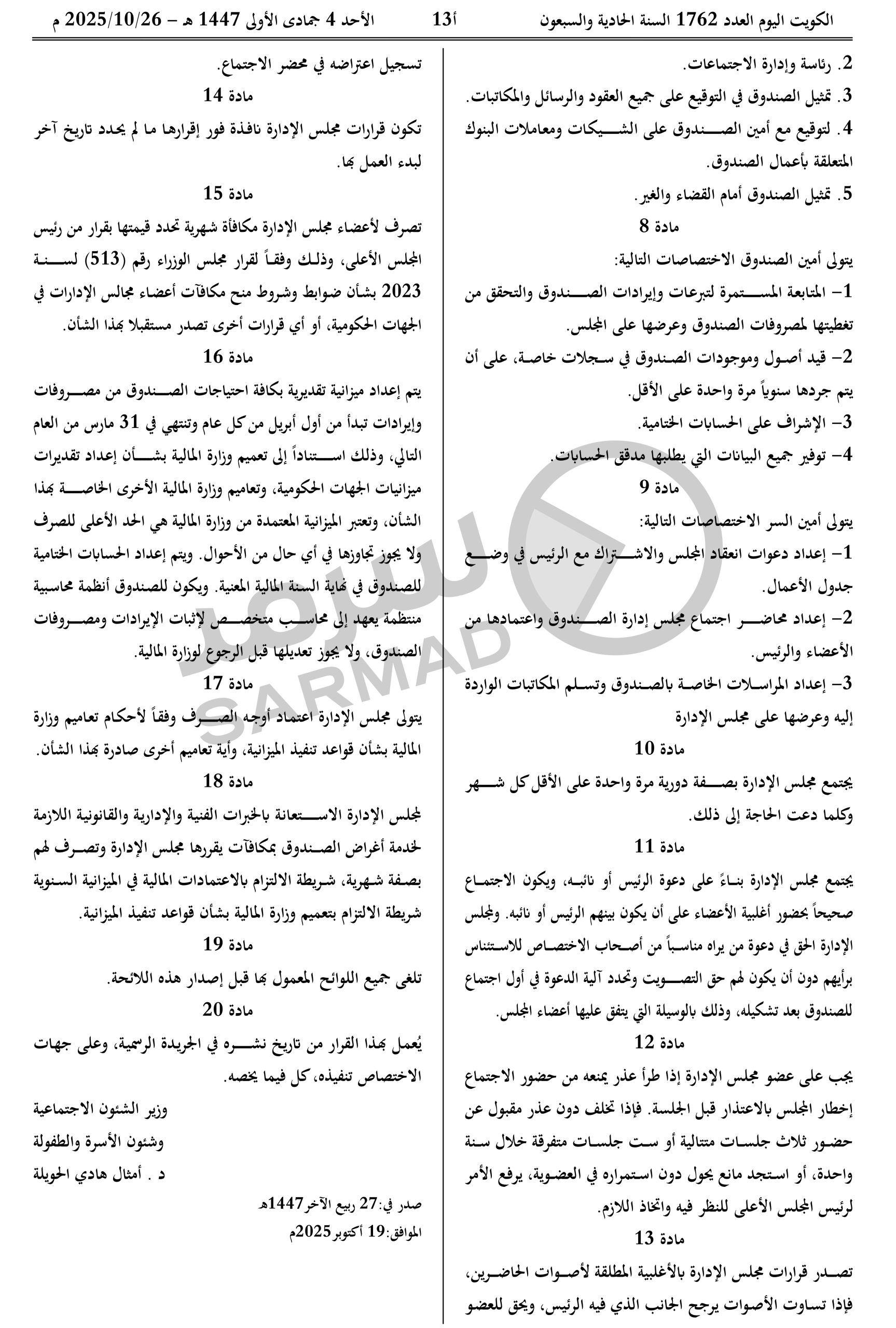 فيما بينت المادة السادسة أن يختص مجلس إدارة الصندوق بتنظيم آلية استقبال التبرعات والهبات والموافقات اللازمة لقبولها، وتحديد الفئات المستفيدة من المنح وشروط الاستفادة منها، والمحافظة على موارد الصندوق وتنميتها، واعتماد الميزانية السنوية والحسابات الختامية المتعلقة بها كل عام، واختيار مدقق الحسابات الخارجي لاعتماد حسابات الصندوق، ويتم اختيار مدقق الحسابات الخارجي وفقا للضوابط والشروط التي يحددها مجلس الإدارة.