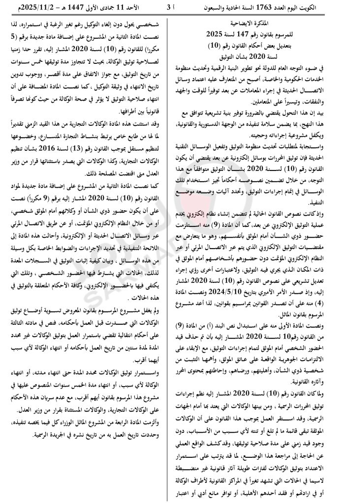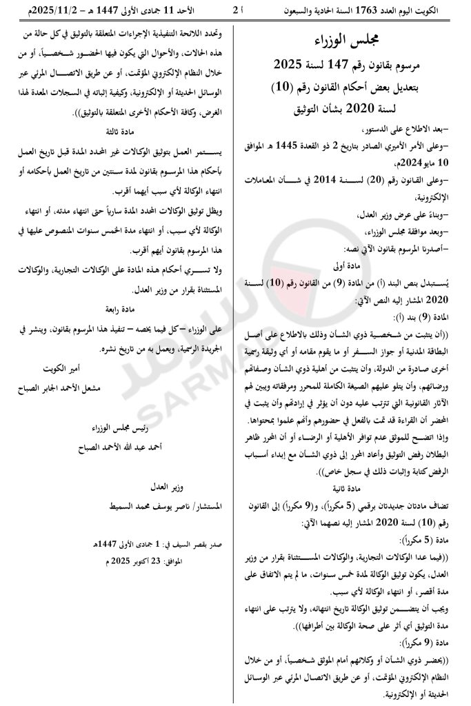 صدر اليوم الأحد في الجريدة الرسمية «الكويت اليوم» مرسوم بقانون رقم 147 لسنة 2025 بتعديل بعض أحكام القانون رقم (10) لسنة 2020 في شأن التوثيق.