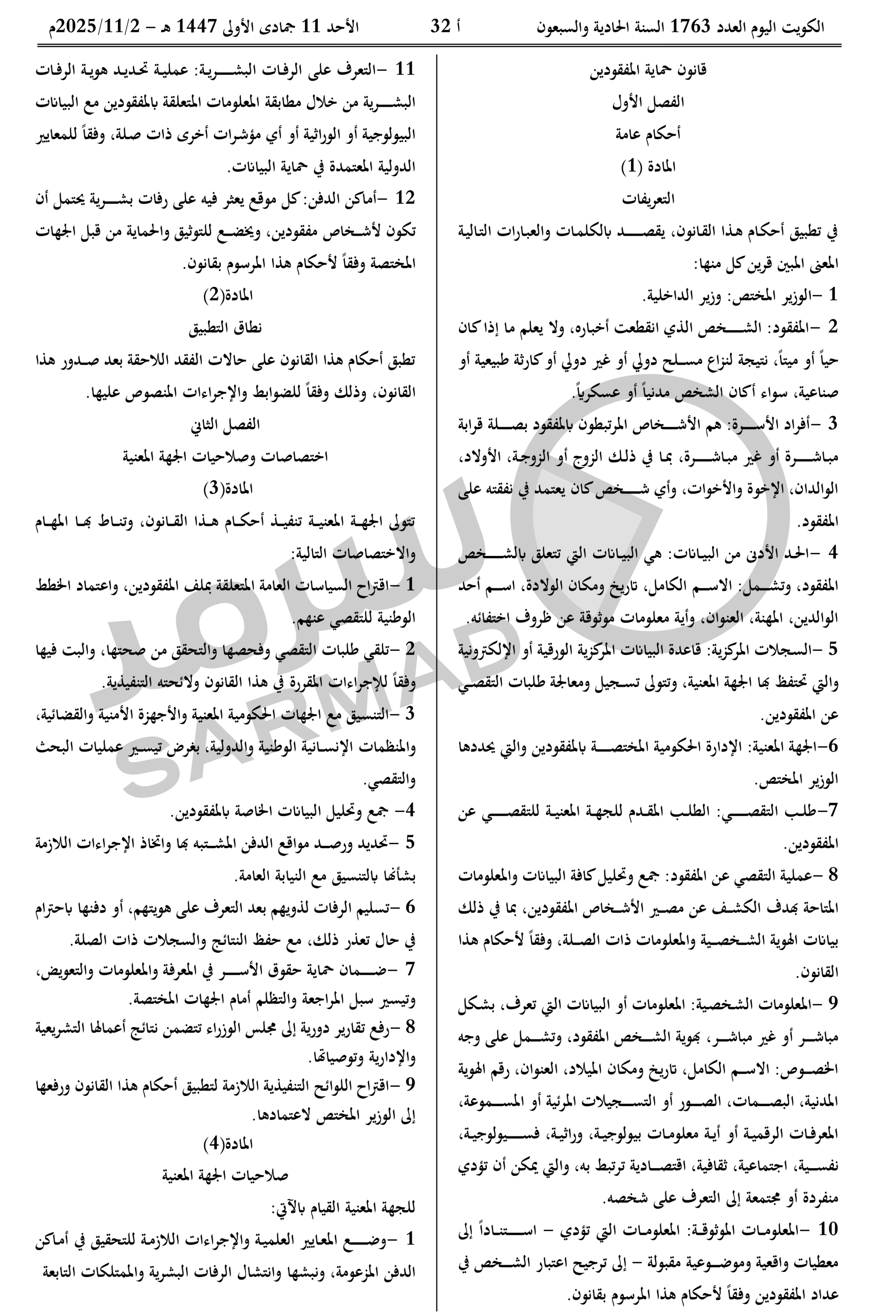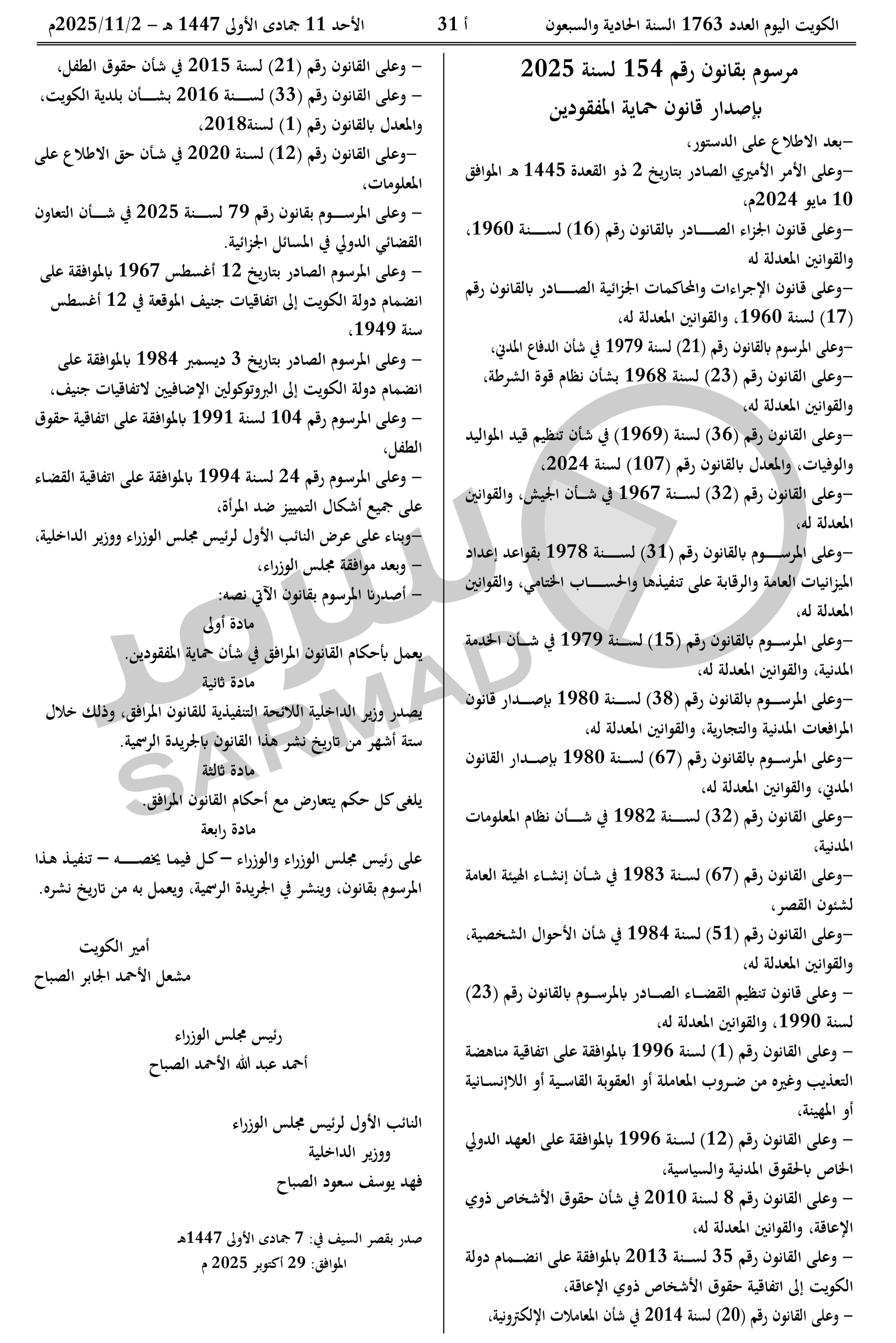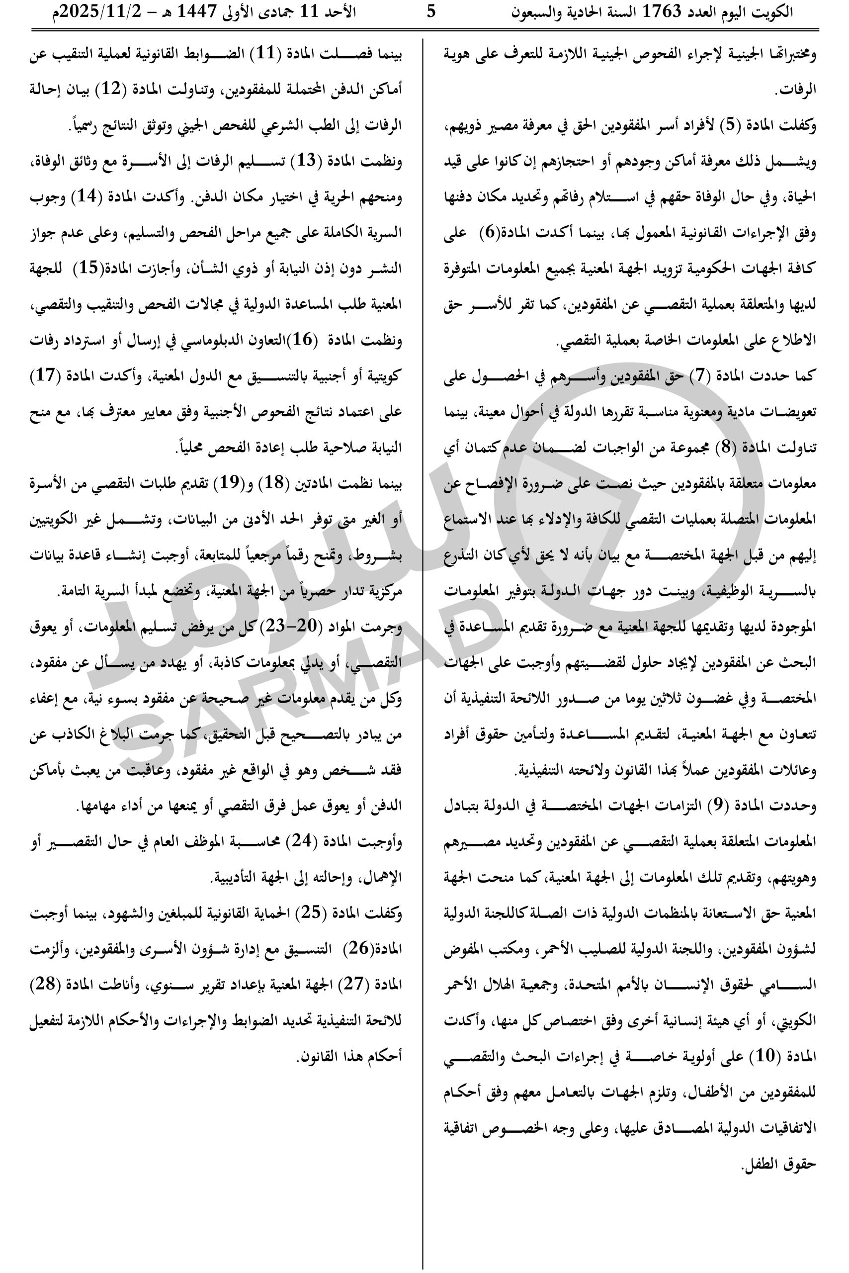 صدر، في عدد الجريدة الرسمية «الكويت اليوم»، الصادر اليوم الأحد، مرسوم بقانون رقم 154 لسنة 2025، بإصدار قانون حماية المفقودين.