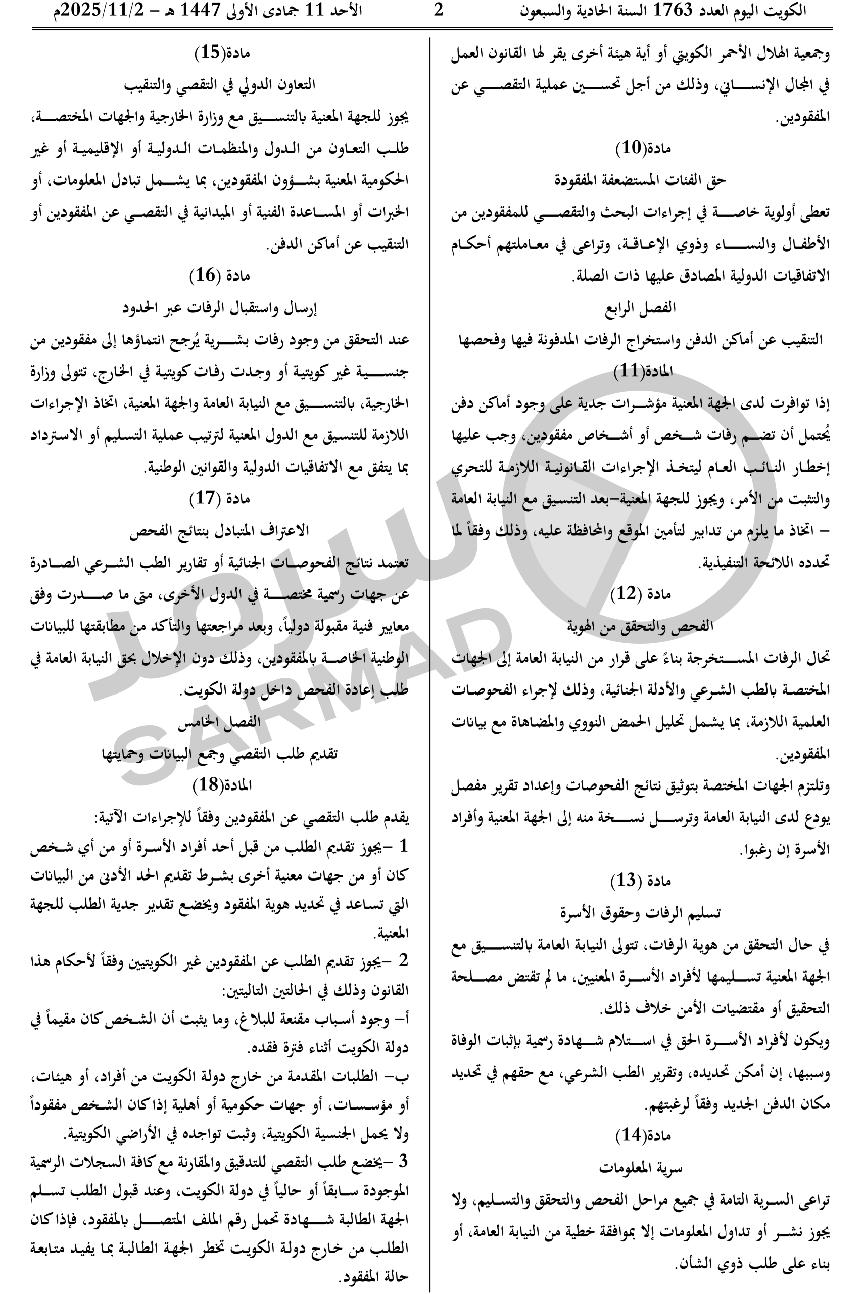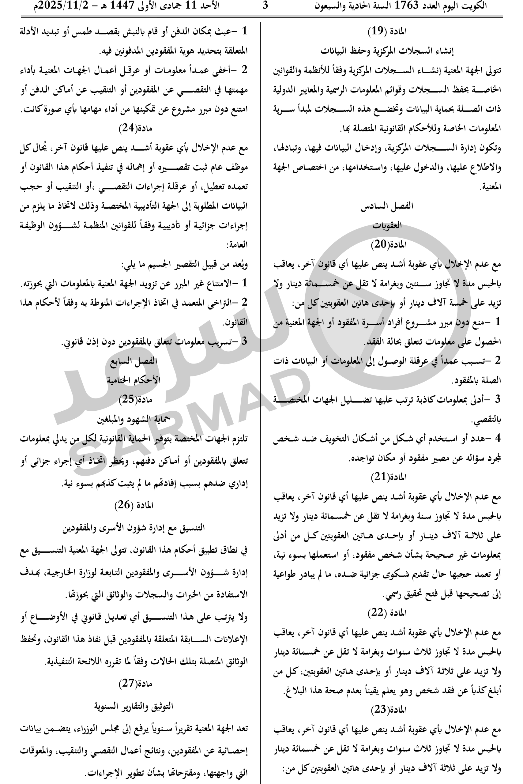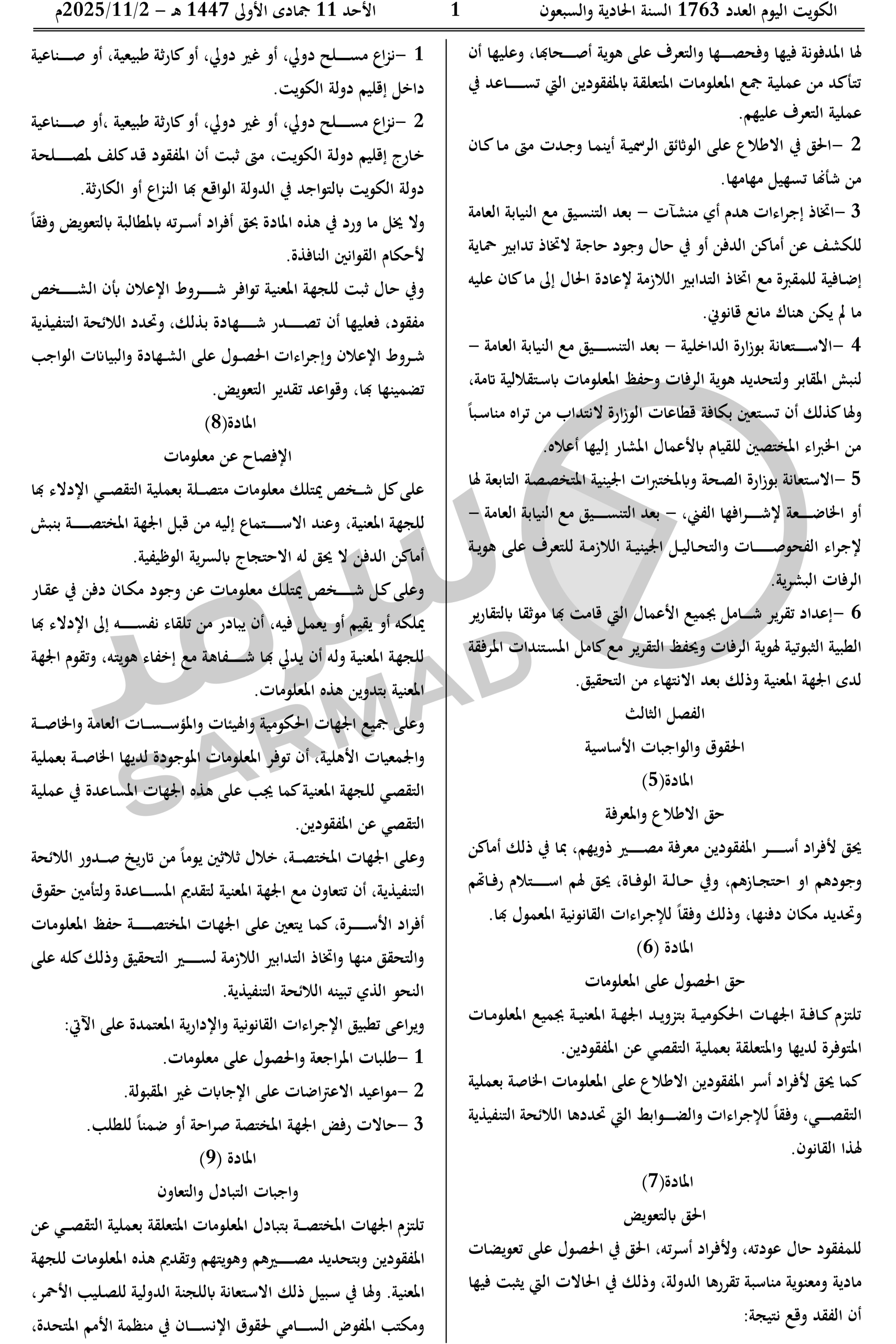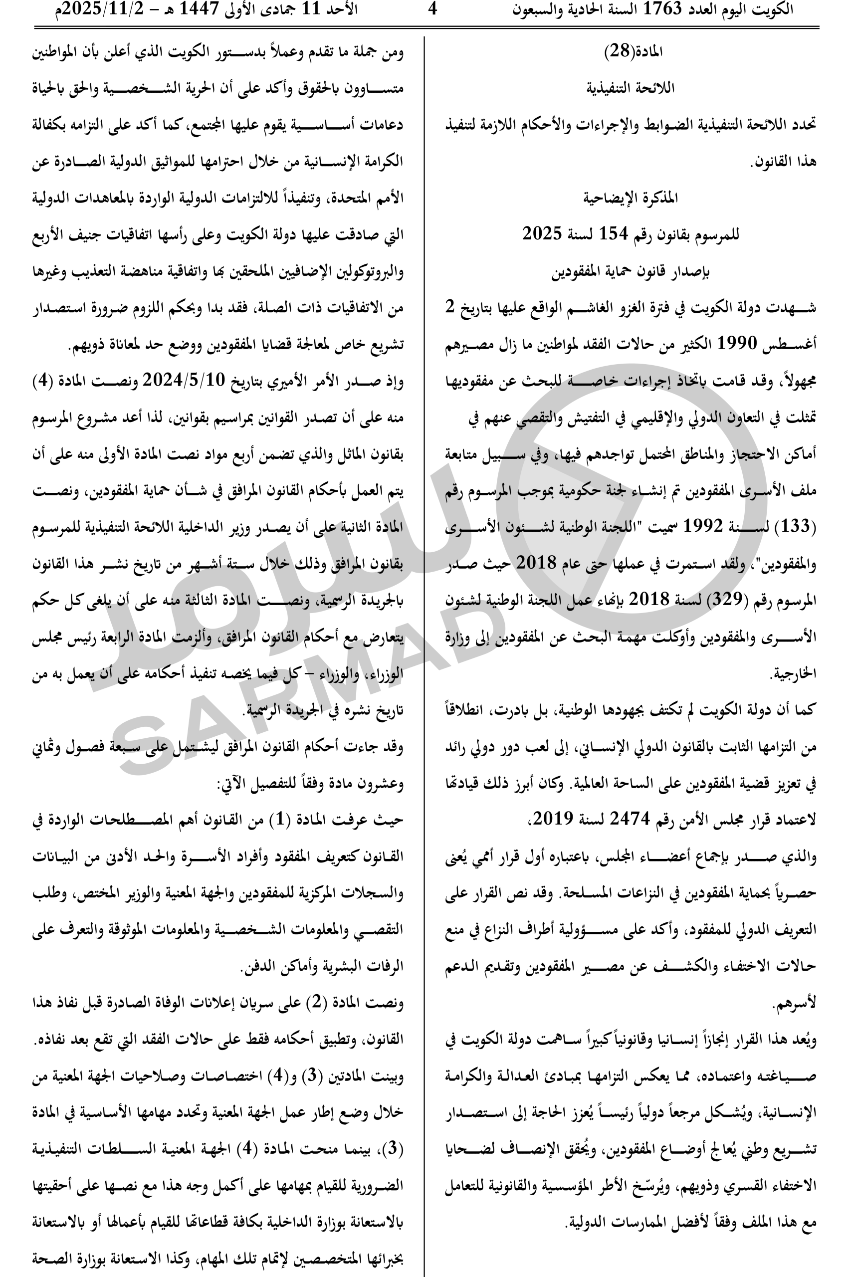 صدر، في عدد الجريدة الرسمية «الكويت اليوم»، الصادر اليوم الأحد، مرسوم بقانون رقم 154 لسنة 2025، بإصدار قانون حماية المفقودين.