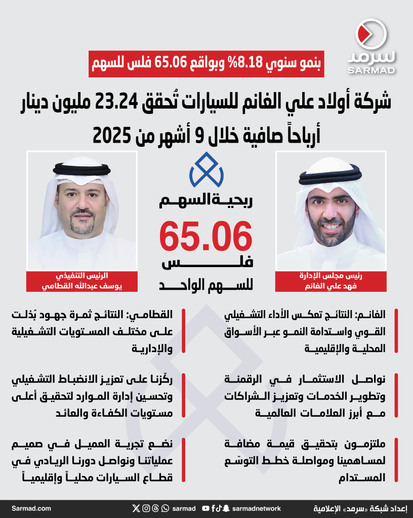 شركة أولاد علي الغانم للسيارات تحقّق 23.24 مليون دينار أرباحاً صافية في التسعة أشهر المنتهية في 30 سبتمبر 2025 بنمو 8.18 %