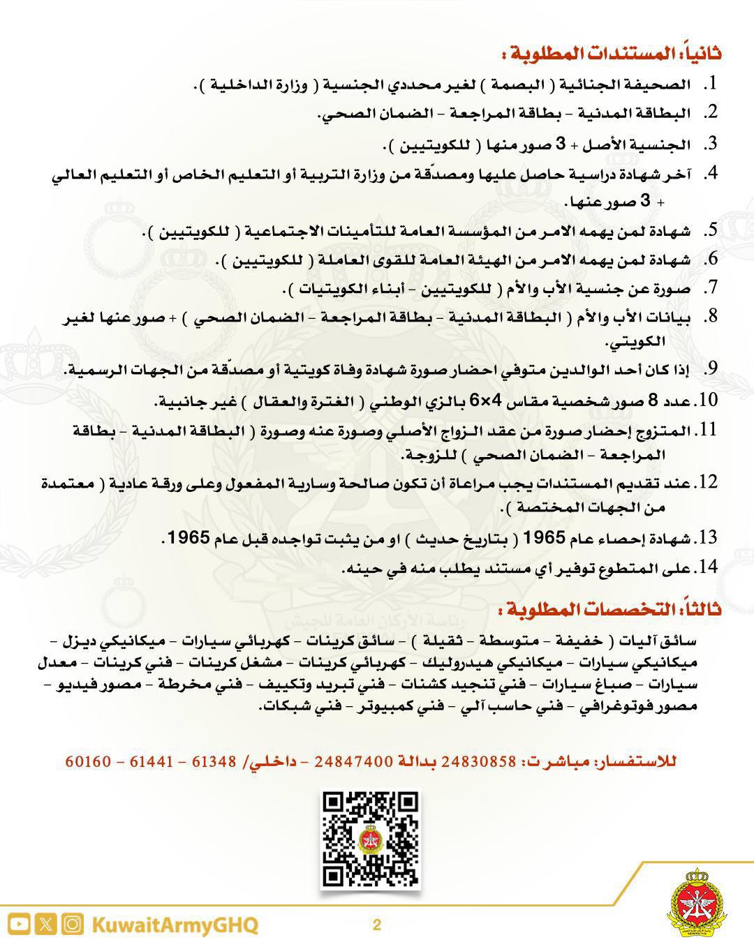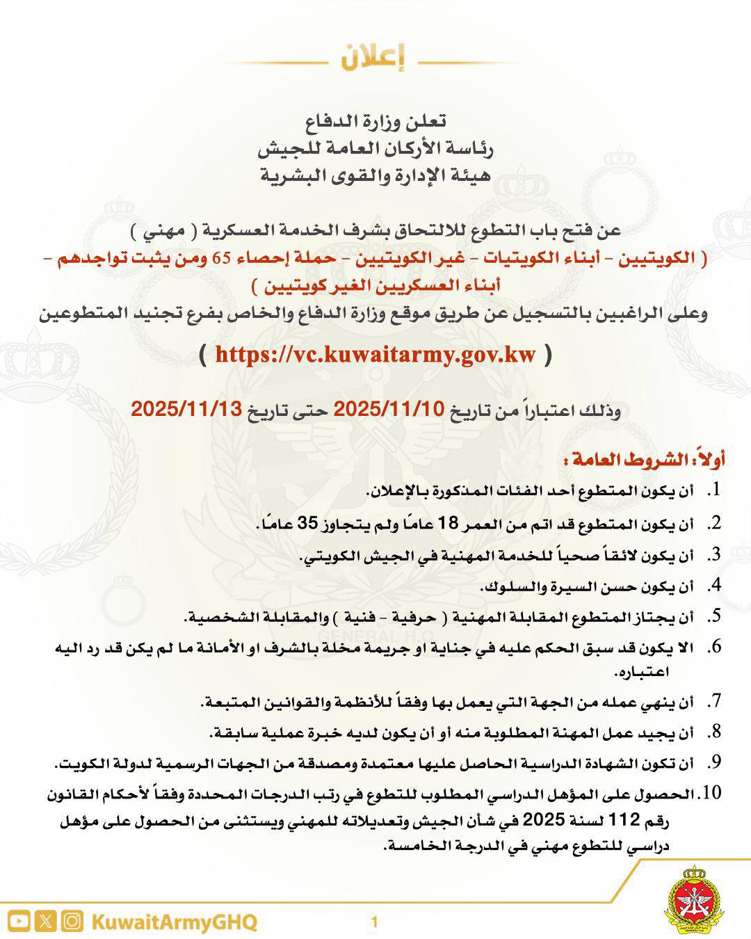 أعلنت رئاسة الأركان العامة للجيش «هيئة الإدارة والقوى البشرية»، اليوم الإثنين، عن فتح باب التطوع للالتحاق بشرف الخدمة العسكرية «مهني»، للكويتيين وأبناء الكويتيات وغير الكويتيين وحملة إحصاء 65 ومن ثبت تواجدهم وأبناء العسكريين غير الكويتيين».
