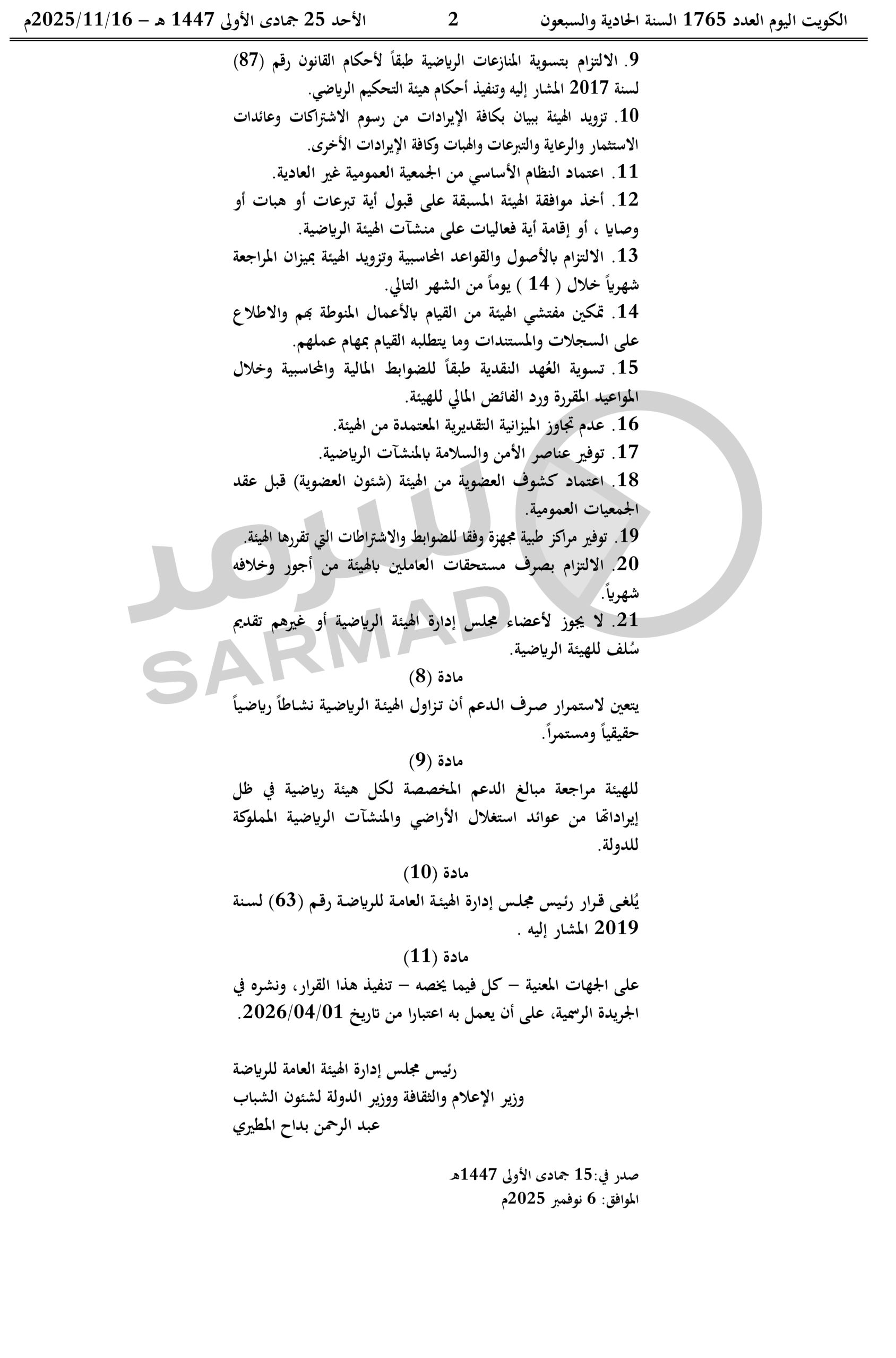 أصدرت الهيئة العامة للرياضة، في عدد الجريدة الرسمية الكويت اليوم، الصادر اليوم الأحد، قراراً بشأن ضوابط دعم الهيئات الرياضية.
