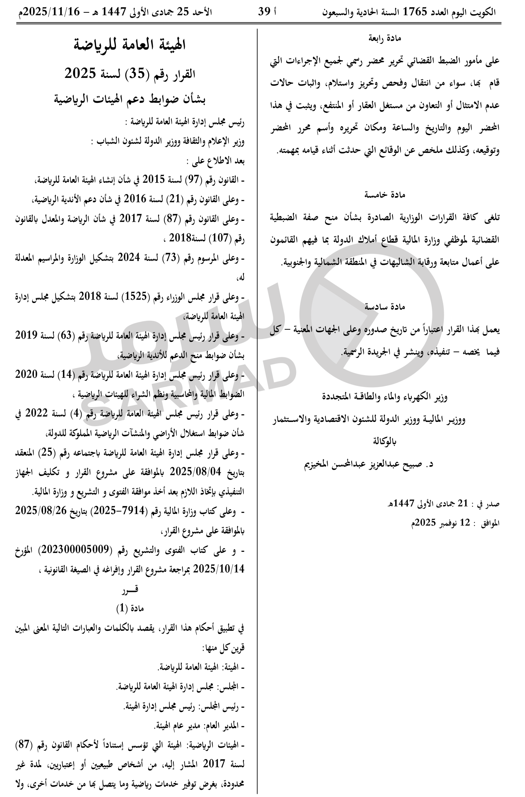 أصدرت الهيئة العامة للرياضة، في عدد الجريدة الرسمية الكويت اليوم، الصادر اليوم الأحد، قراراً بشأن ضوابط دعم الهيئات الرياضية.