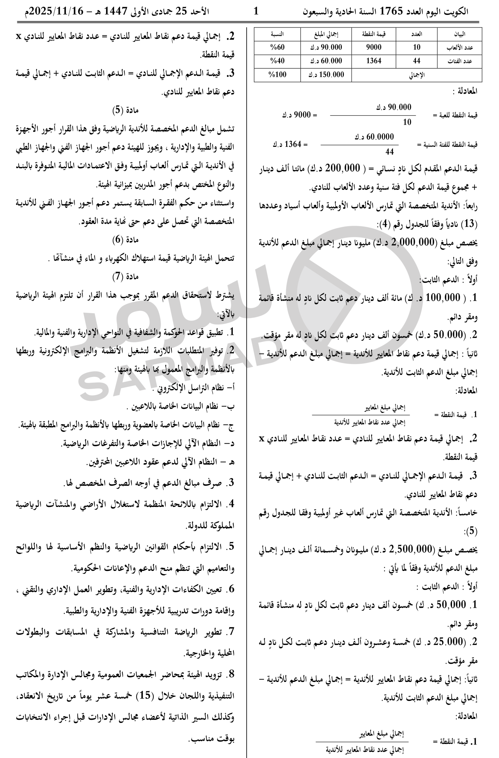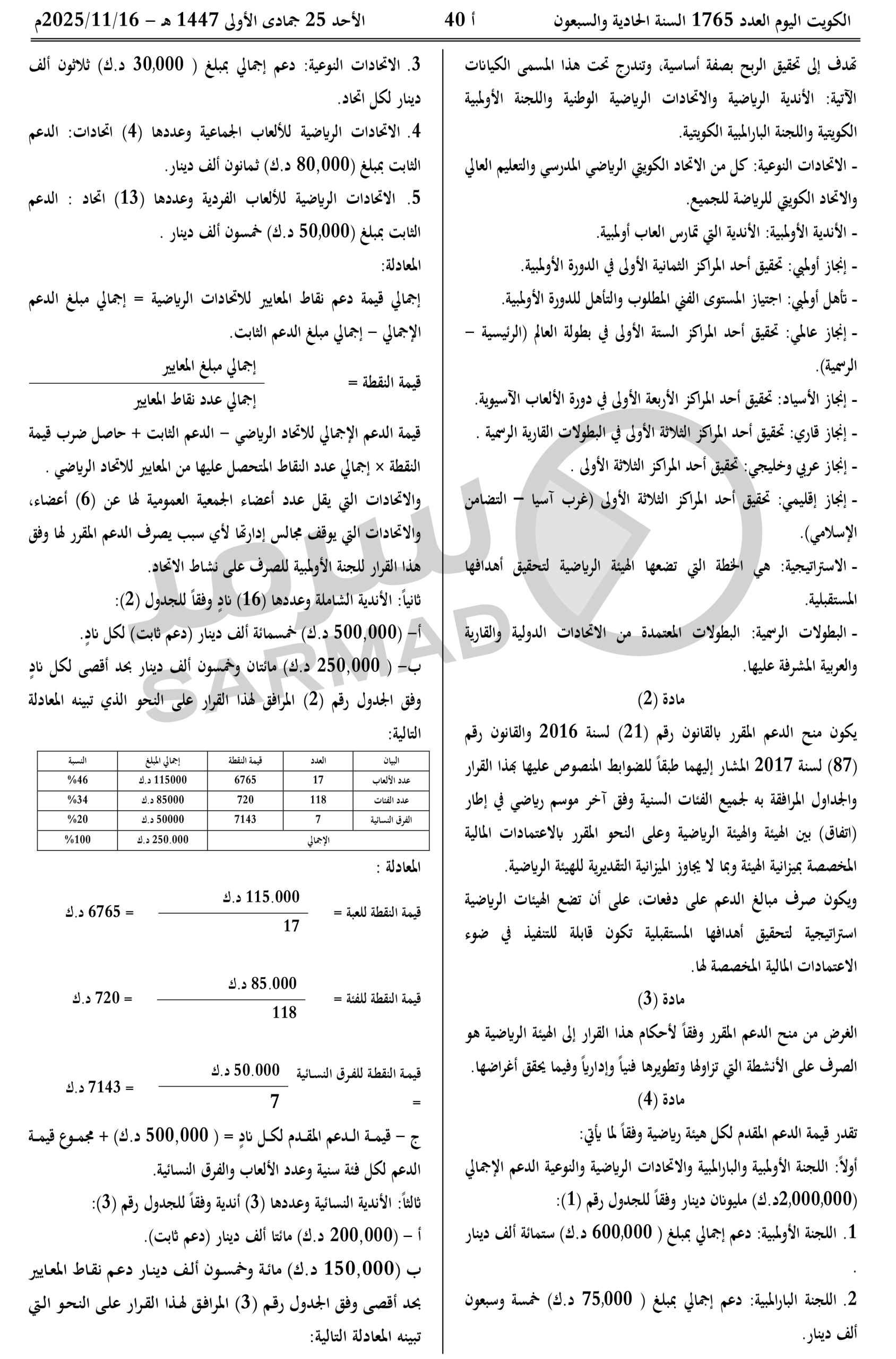 ونصت المادة الثانية، على أن يكون منح الدعم المقرر بالقانونين رقم «21» لسنة 2016 و«87» لسنة 2017 وفق الضوابط المرافقة للقرار ولجميع الفئات السنية، ويكون صرف الدعم على دفعات، على أن تضع الهيئات الرياضية استراتيجية لتحقيق أهدافها المستقبلية تكون قابلة للتنفيذ في إطار الاعتمادات المالية المخصصة.