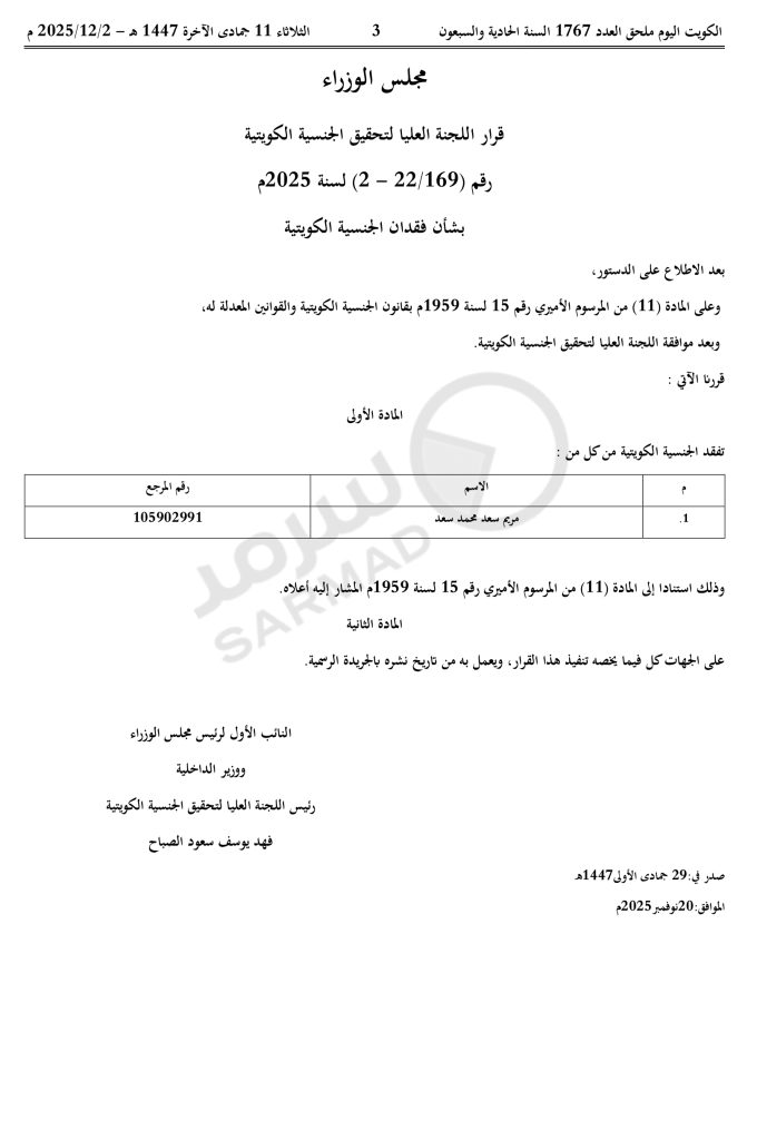 صدر اليوم الثلاثاء في ملحق عدد الجريدة الرسمية «الكويت اليوم»، قرار من اللجنة العليا لتحقيق الجنسية الكويتية حمل رقم (169/ 22-2) لسنة 2025 بفقد الجنسية من امرأة.