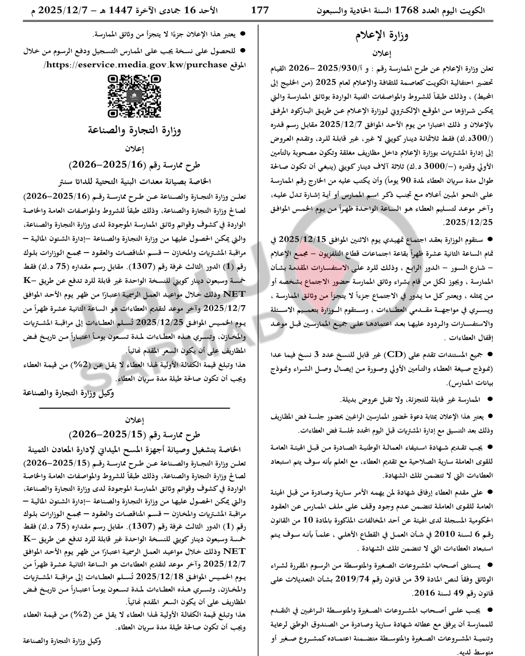أعلنت وزارة الإعلام، في الجريدة الرسمية «الكويت اليوم»، في العدد الصادر اليوم الأحد، عن طرح ممارسة القيام بتحضير احتفالية الكويت كعاصمة للثقافة والإعلام لعام 2025 «من الخليج إلى المحيط»، وذلك طبقاً للشروط والمواصفات الفنية الواردة بوثائق الممارسة، والتي يمكن شراؤها من الموقع الإلكتروني لوزارة الإعلام، وذلك اعتباراً من اليوم مقابل رسم قدره 300 دينار غير قابلة للرد، وآخر موعد لتسليم العطاء الساعة الواحدة ظهراً يوم الخميس 25 الجاري.