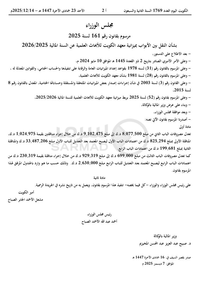 صدر اليوم الأحد في الجريدة الرسمية «الكويت اليوم»، مرسوم بقانون رقم 161 لسنة 2025 بشأن النقل بين الأبواب بميزانية معهد الكويت للأبحاث العلمية عن السنة المالية 2026/2025.