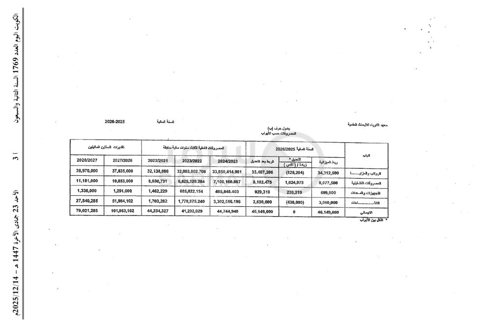 ونصّ المرسوم على أن تعدّل مصروفات الباب الثاني من مبلغ 8,077,500 د.ك إلى مبلغ 9,102,475 د.ك من خلال إجراء مناقلتين بقيمة 1,024,975 د.ك.