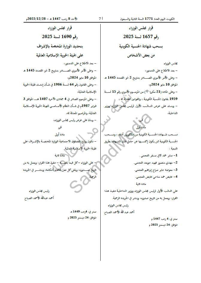 كما نصّ القرار الذي حمل الرقم 1657 لسنة 2025 على سحب الجنسية الكويتية ممن يكون قد اكتسبها معهم بالتبعية.
