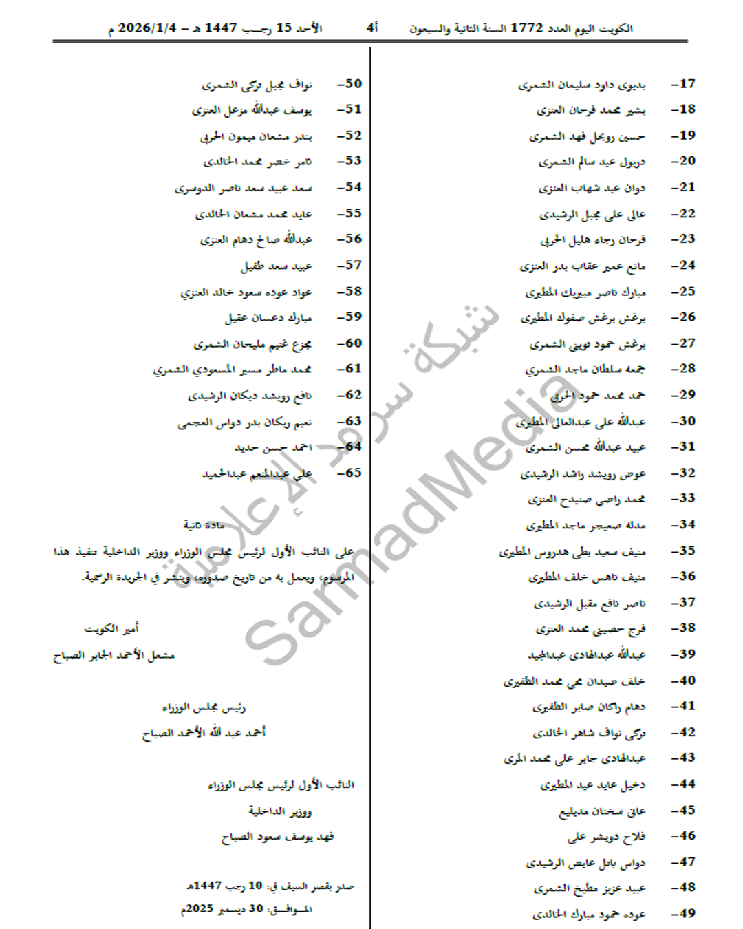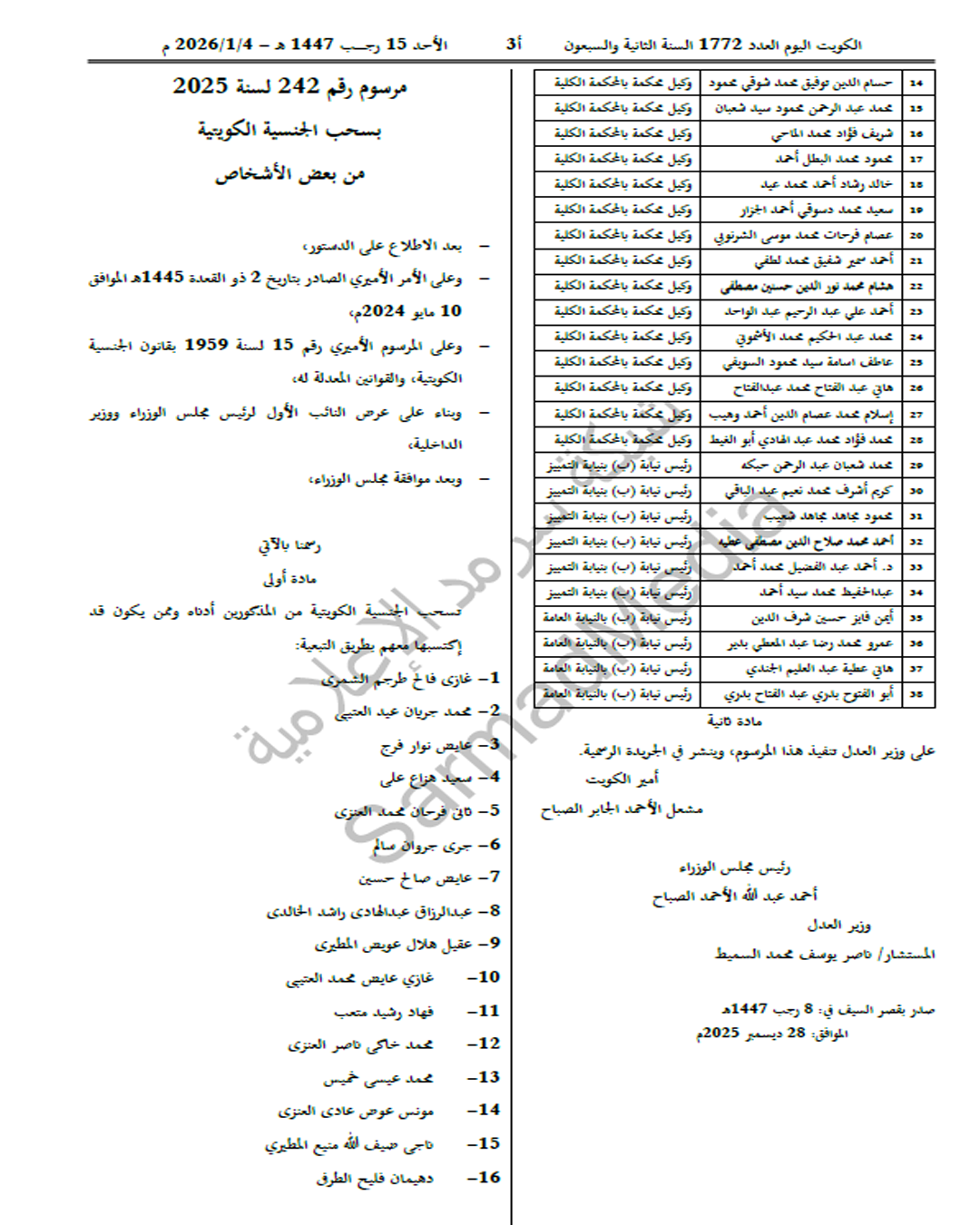 صدر، في الجريدة الرسمية «الكويت اليوم»، في العدد الصادر اليوم الأحد، مرسومان بسحب الجنسية الكويتية من 69 شخصاً، وممن اكتسبها معهم بالتبعية.
