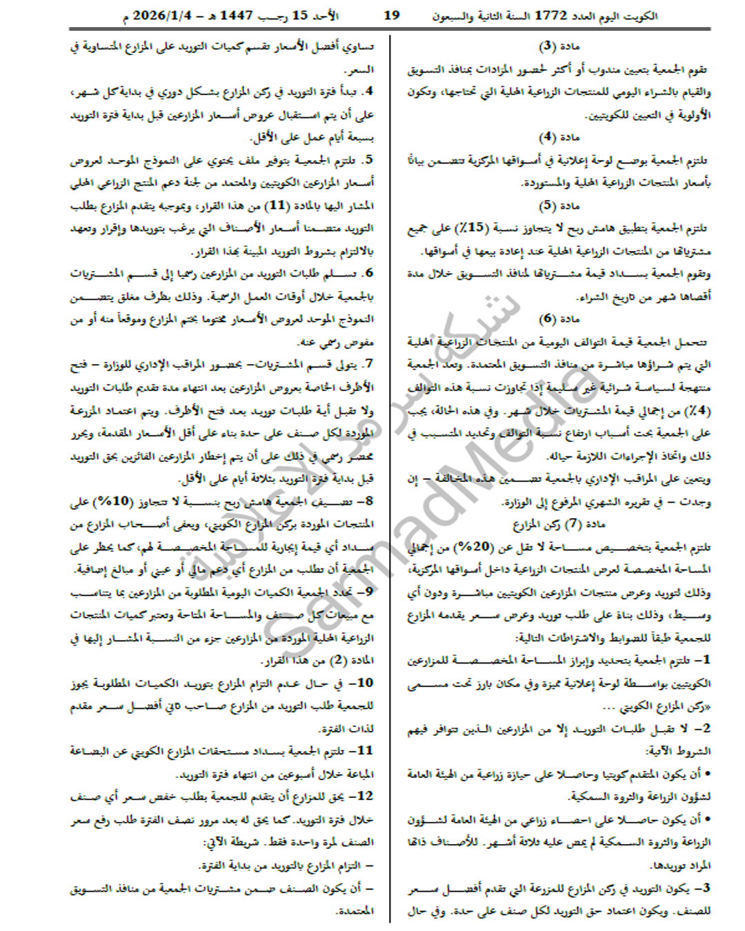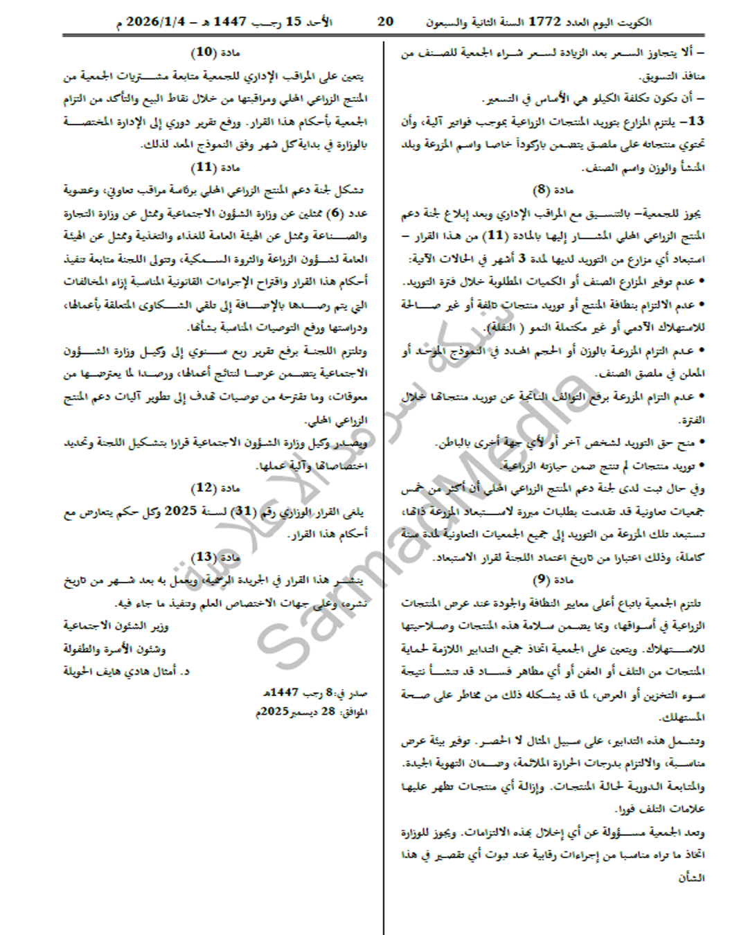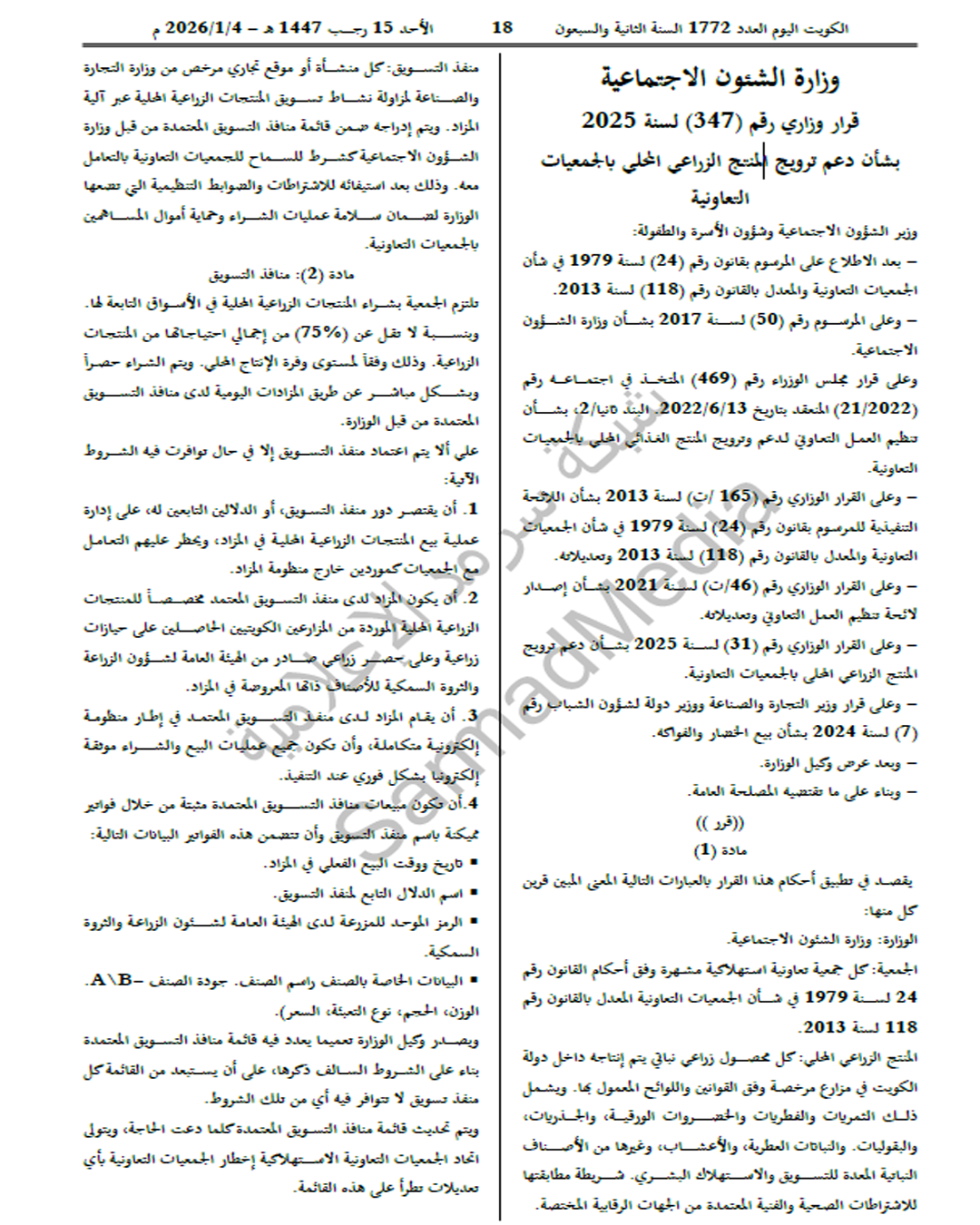 صدر، في الجريدة الرسمية «الكويت اليوم»، في العدد الصادر اليوم الأحد، قرار وزارة الشؤون رقم 347 لسنة 2025، بشأن دعم ترويج المنتج الزراعي المحلي بالجمعيات التعاونية.