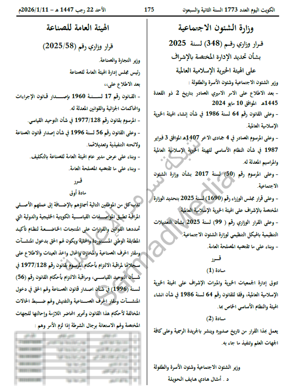 أصدرت وزيرة الشؤون الاجتماعية وشؤون الأسرة والطفولة د. أمثال الحويلة، قراراً وزارياً بشأن تحديد الإدارة المختصة بالإشراف على الهيئة الخيرية الإسلامية العالمية.