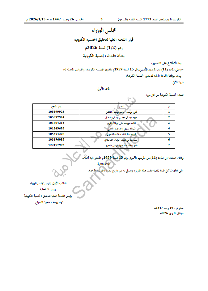 ونصّ القرار رقم (1/2) لسنة 2026 على فقد الجنسية من 7 أشخاص، استناداً إلى المادة «11» من المرسوم الأميري رقم 15 لسنة 1959 م بقانون الجنسية الكويتية والقوانين المعدلة له.