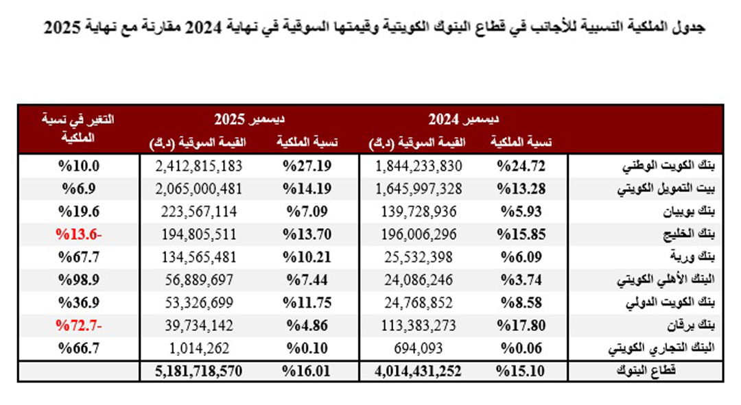 وذكر التقرير أن أعلى ارتفاع نسبي في الملكية خلال الفترة كان من نصيب البنك الأهلي الكويتي وبنحو 98.9 في المئة أو من نحو 3.74 في المئة في نهاية عام 2024 إلى نحو 7.44 في المئة، وأعلى انخفاض نسبي في ملكية الأجانب كان من نصيب بنك برقان حيث انخفضت نسبة تملكهم بنحو 72.7 في المئة أي من نحو 17.80 في المئة إلى نحو 4.86 في المئة.