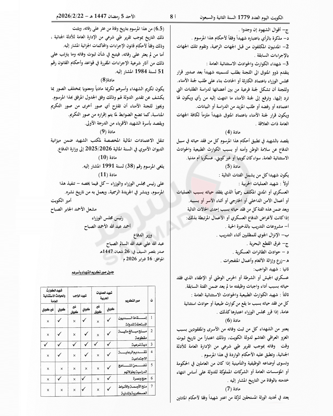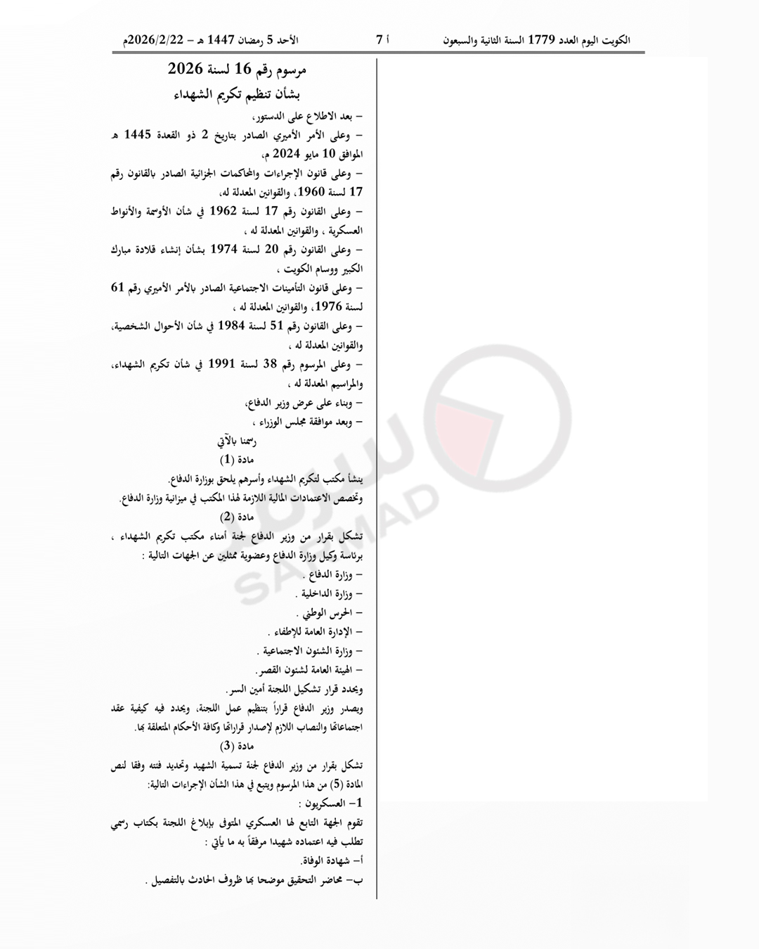 صدر اليوم، في الجريدة الرسمية «الكويت اليوم»، في العدد الصادر اليوم الأحد، مرسوم بشأن تكريم الشهداء.