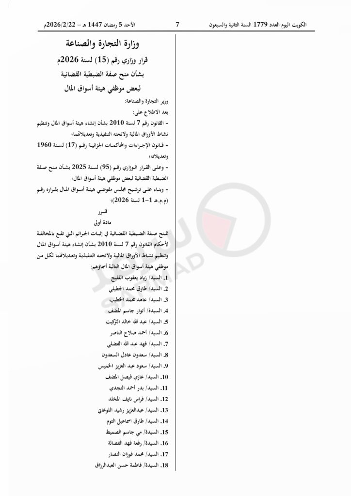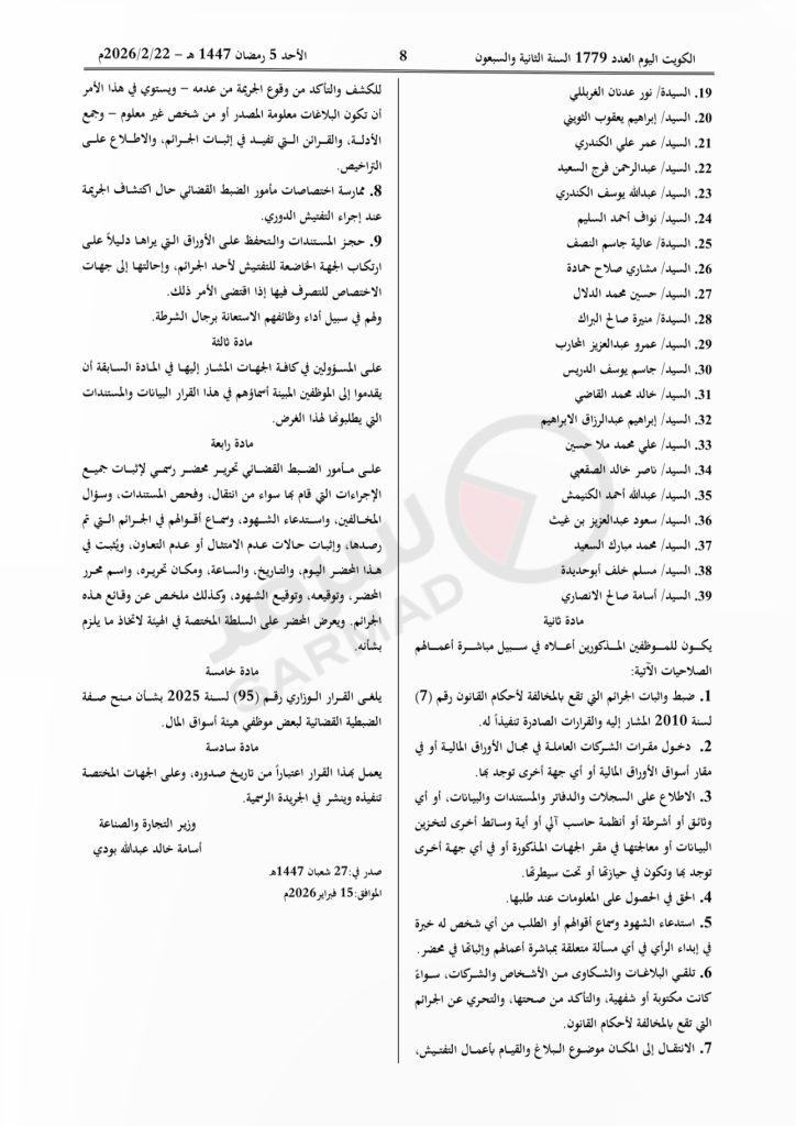 وجاء في المادة الخامسة «يلغى القرار الوزاري رقم (95) لسنة 2025 بشأن الضبطية القضائية لبعض موظفي هيئة أسواق المال».