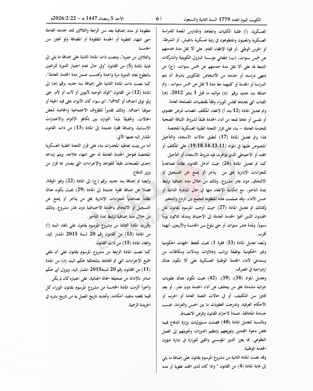 صدر اليوم، في الجريدة الرسمية «الكويت اليوم»، في العدد الصادر اليوم الأحد، مرسوم بقانون بتعديل بعض أحكام قانون الخدمة الوطنية العسكرية، لعلاج بعض الثغرات وأوجه القصور، بهدف تطوير منظومة الدفاع الوطني وتعزيز جاهزيتها البشرية.