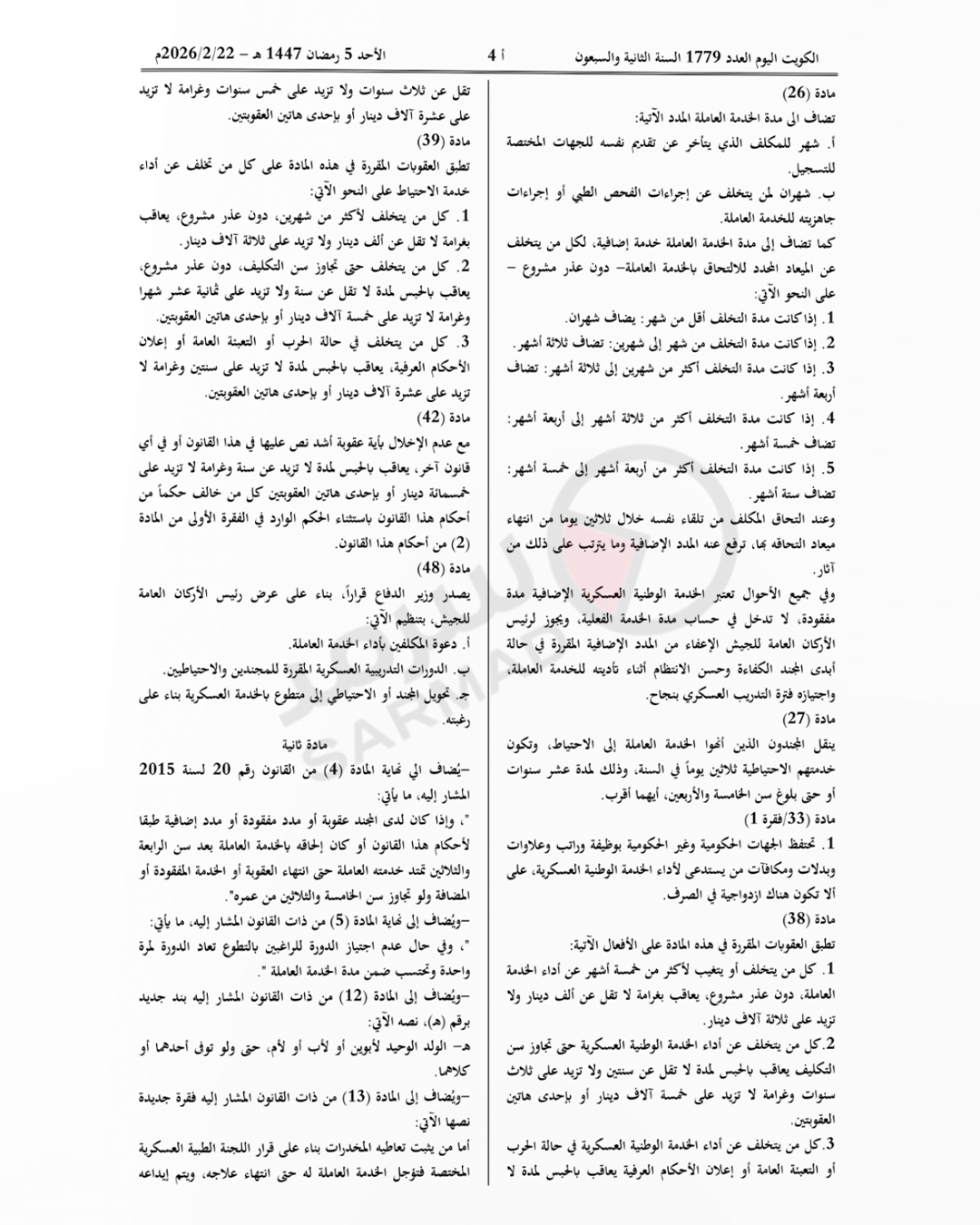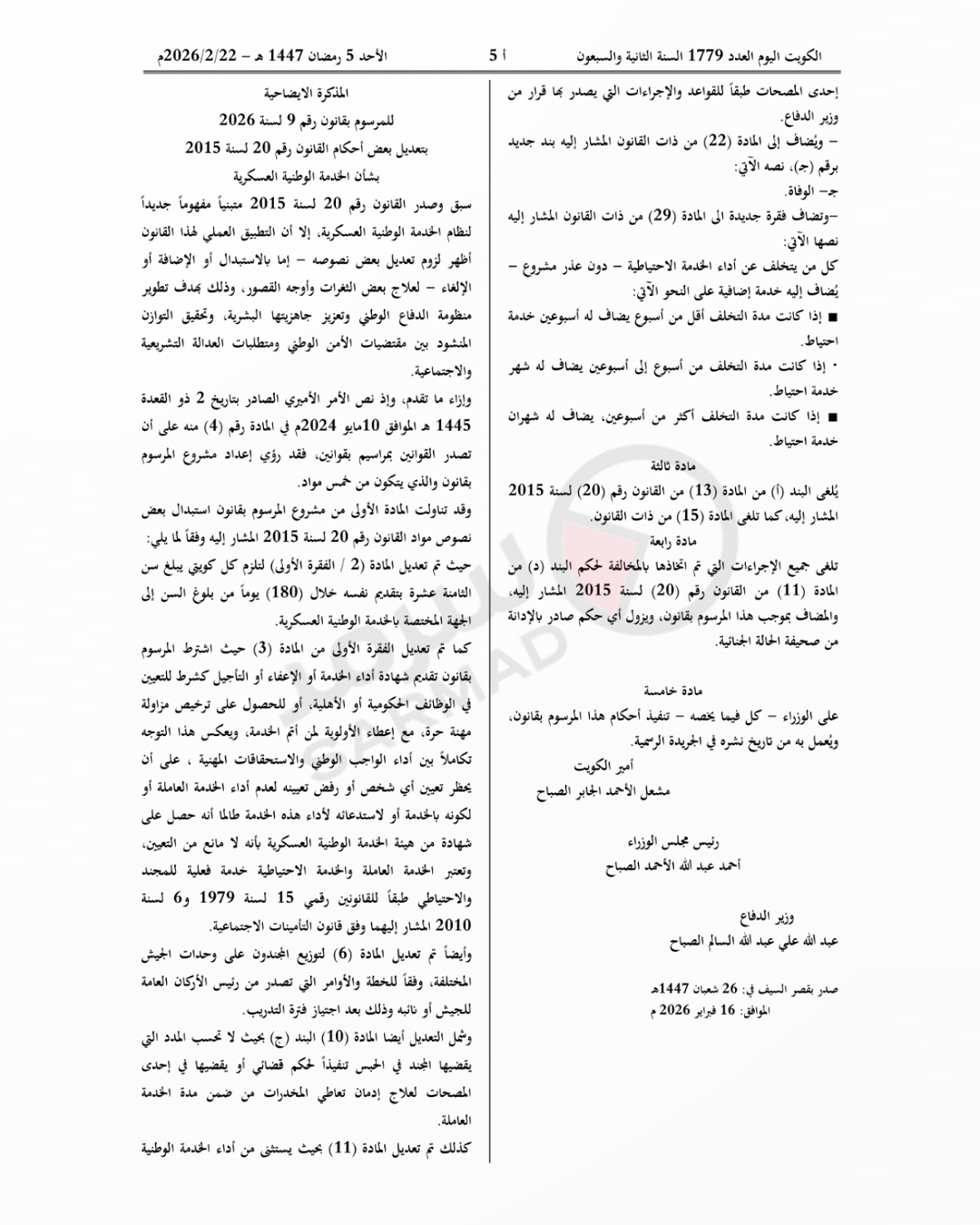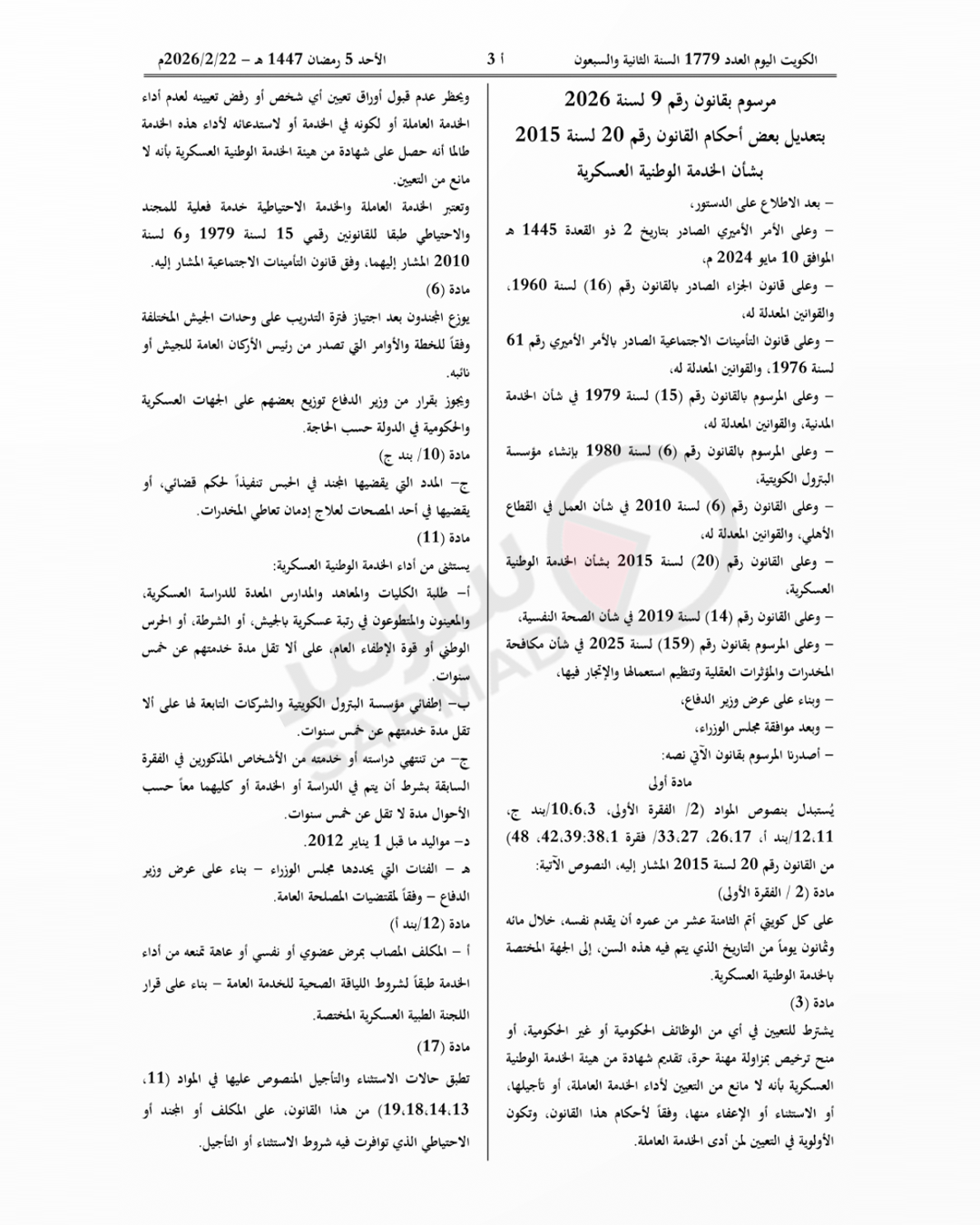 صدر اليوم، في الجريدة الرسمية «الكويت اليوم»، في العدد الصادر اليوم الأحد، مرسوم بقانون بتعديل بعض أحكام قانون الخدمة الوطنية العسكرية، لعلاج بعض الثغرات وأوجه القصور، بهدف تطوير منظومة الدفاع الوطني وتعزيز جاهزيتها البشرية.