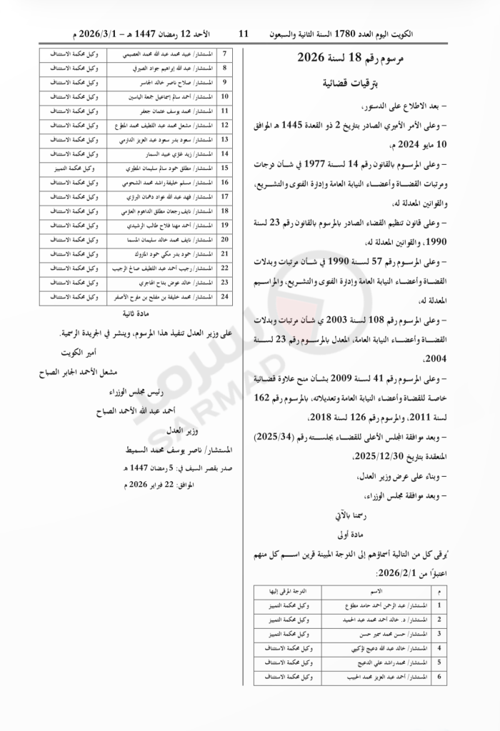 صدر اليوم الأحد في الجريدة الرسمية «الكويت اليوم»، مرسوم رقم 18 لسنة 2026، بترقيات قضائية.