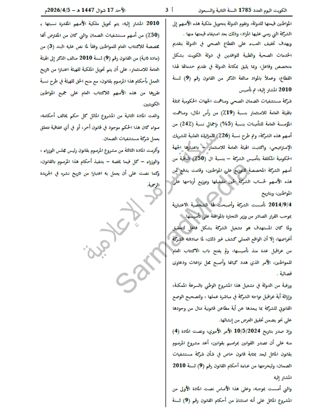 وأوضحت أنه رغبة من الدولة في تشغيل هذا المشروع الوطني بالسرعة الممكنة وإزالة أية عراقيل تواجه الشركة في مباشرة عملها، ولتصحيح الوضع القانوني للشركة بما يبعدها عن أية مطاعن قانونية تنال من وجودها على نحو يضمن تحقيق الغرض من إنشائها، وإذ صدر بتاريخ 10/5/2024 الأمر الأميري، ونصت المادة 4 منه على أن تصدر القوانين بمراسيم بقوانين، أعد مشروع المرسوم بقانون الماثل ليعد بمثابة قانون خاص في شأن شركة مستشفيات الضمان، وليخرجها من عباءة أحكام القانون رقم 9 لسنة 2010 المشار إليه، والتي أسست بموجبه، وعلى هذا الأساس نصت المادة الأولى من المشروع الماثل على أنه استثناء من أحكام القانون رقم 9 لسنة 2010 المشار إليه، يتم تحويل ملكية الأسهم المقدرة نسبتها بـ%50 من أسهم مستشفيات الضمان والتي كان من المفترض أنها مخصصة للاكتتاب العام للمواطنين وفقاً لما نص عليه البند 3 من مادة ثانية من القانون رقم 9 لسنة 2010 سالف الذكر إلى الهيئة العامة للاستثمار، على أن يتم تحويل الملكية للهيئة، اعتباراً من تاريخ العمل بأحكام هذا المرسوم بقانون مع منح الحق للهيئة في طرح نسبة تقررها من هذه الأسهم للاكتتاب العام على جميع المواطنين الكويتيين.