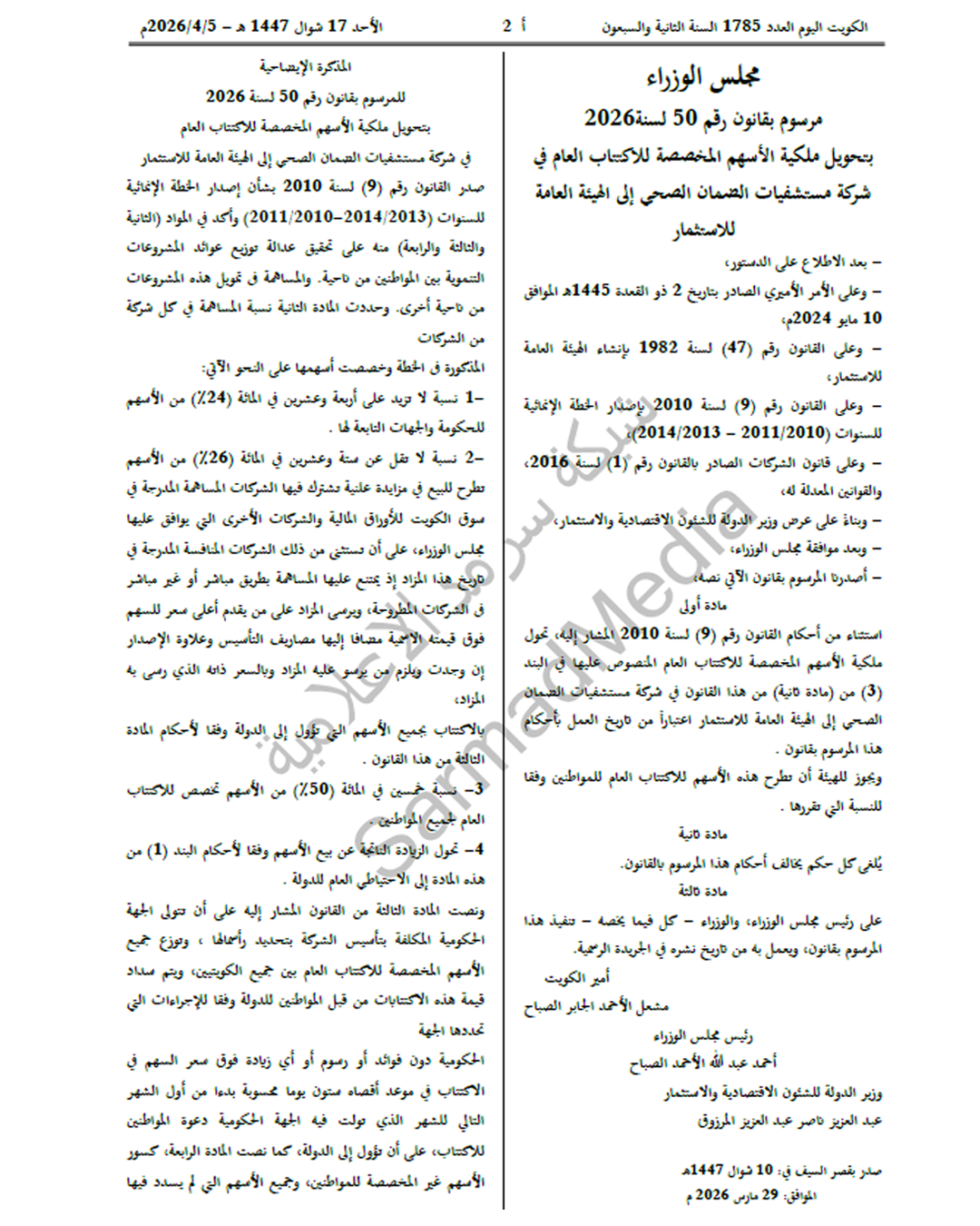صدر في عدد الجريدة الرسمية «الكويت اليوم»، الصادر اليوم الأحد، مرسوم بقانون رقم 50 لسنة 2026 بتحويل ملكية الأسهم المخصصة للاكتتاب العام في شركة مستشفيات الضمان الصحي إلى الهيئة العامة للاستثمار.