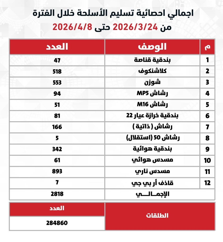 وكشفت «الداخلية» في بيان صحفي، أن المهلة الاستثنائية أسفرت عن تسليم 2818 قطعة سلاح و284860 طلقة، وذلك خلال الفترة التي استمرت من 24 مارس الماضي وحتى 8 أبريل الجاري.