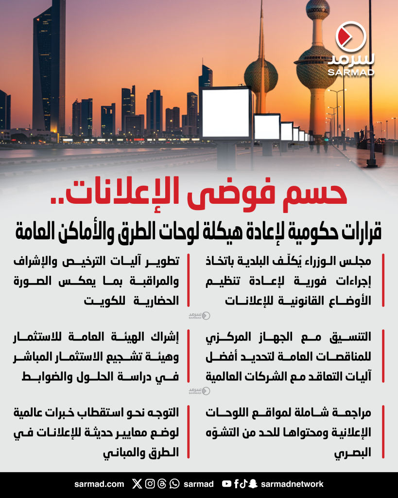 وبناء على هذا الخطاب كلف مجلس الوزراء، بلدية الكويت، اتخاذ خطوات فورية؛ لإعادة تنظيم الأوضاع القانونية للإعلانات في الأماكن العامة، وتطوير إجراءات الترخيص والإشراف والمراقبة، على نحو يعكس الصورة اللائقة للكويت.