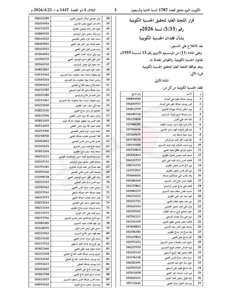 صدر اليوم الثلاثاء، في ملحق الجريدة الرسمية «الكويت اليوم»، قراران من اللجنة العليا لتحقيق الجنسية الكويتية بفقدان الجنسية من 172 شخصاً.