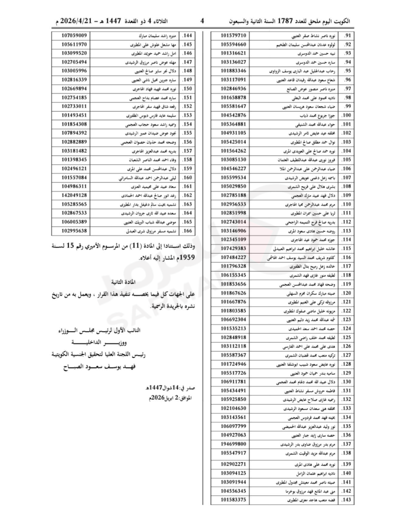 كما نصّ القرار الثاني، رقم (5/33) لسنة 2026م، على فقدانها من 166 شخصاً، استناداً إلى المادة (11) من المرسوم الأميري رقم 15 لسنة 1959.