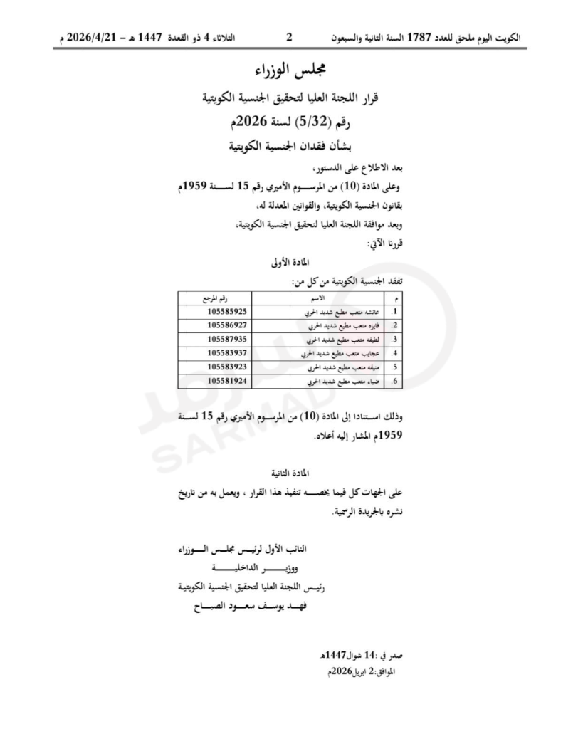 ونصّ القرار الأول، الذي حمل رقم (5/32) لسنة 2026م على فقدانها من 6 أشخاص، استناداً إلى المادة (10) من المرسوم الأميري رقم 15 لسنة 1959.