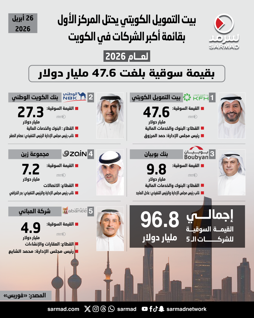 إنفوجراف سرمد | بيت التمويل الكويتي يحتل المركز الأول بقائمة أكبر الشركات في الكويت بقيمة سوقية بلغت 47.6 مليار دولار